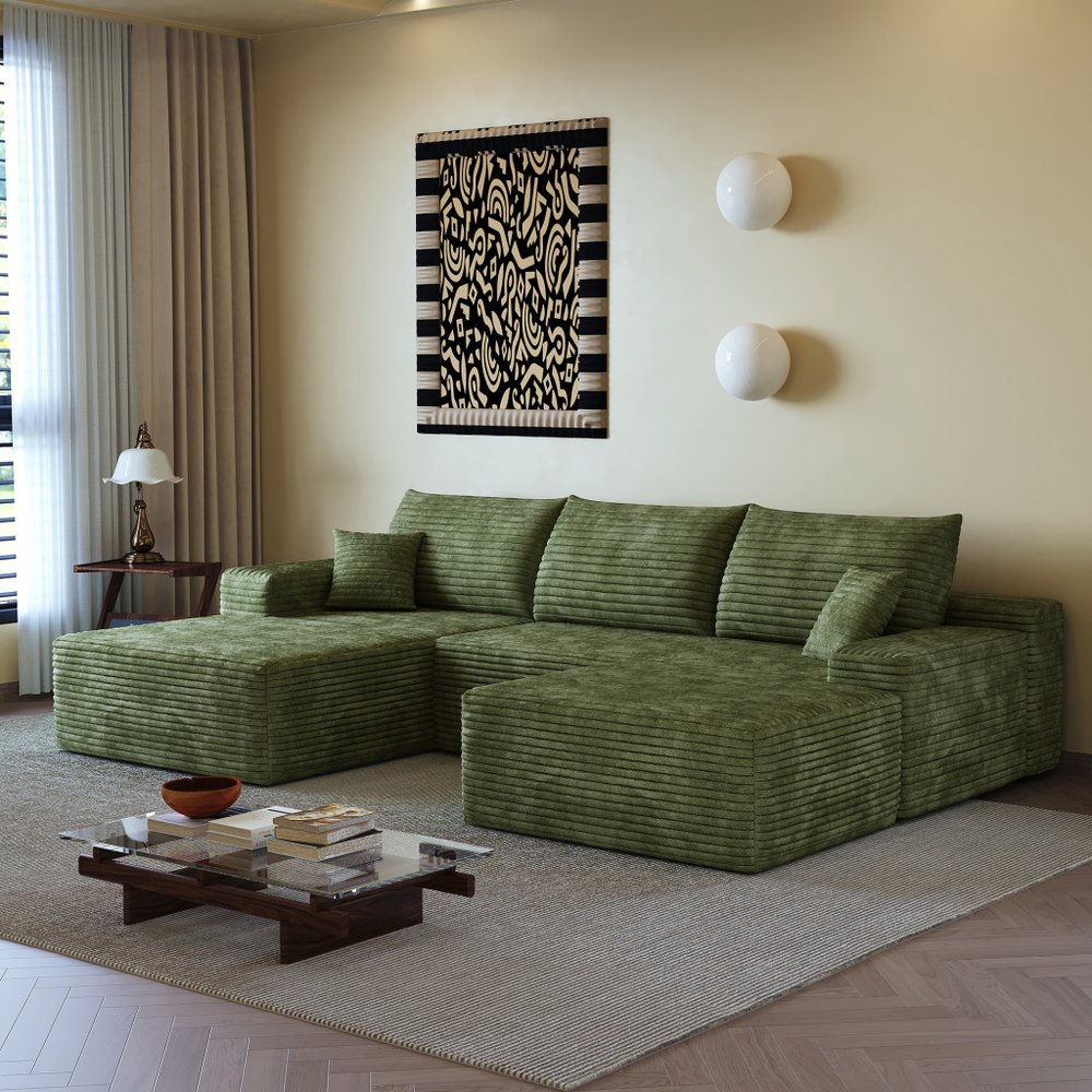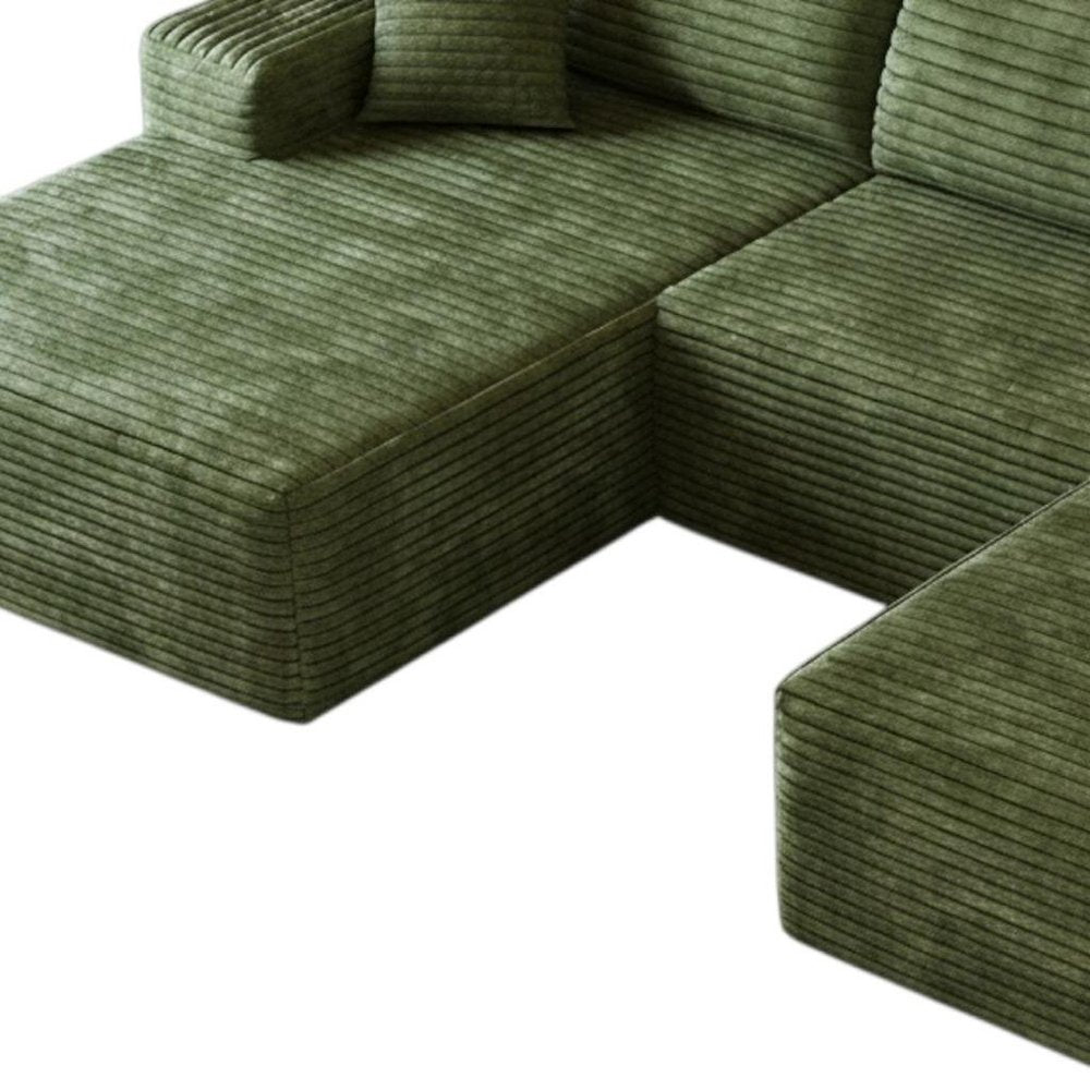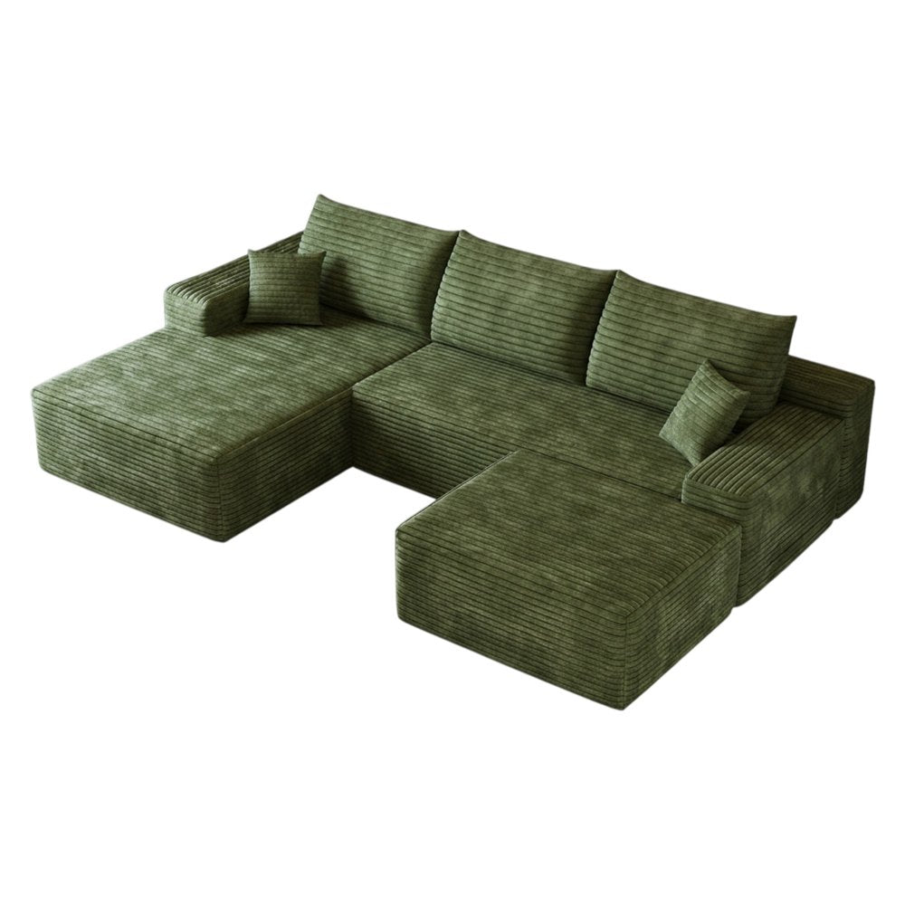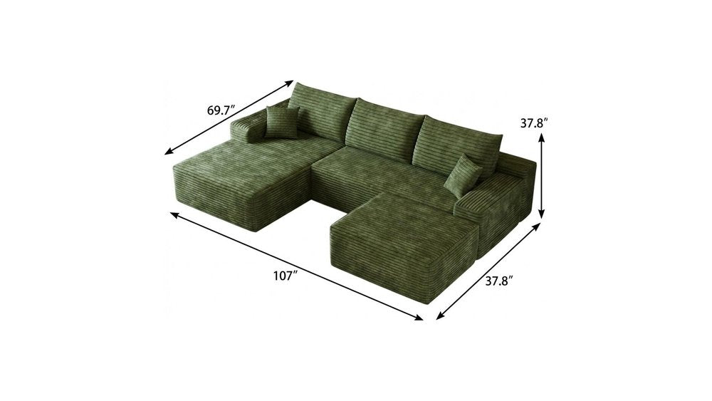 107" Green Corduroy Modular Compression Foam Sofa With Ottoman And Toss Pillows