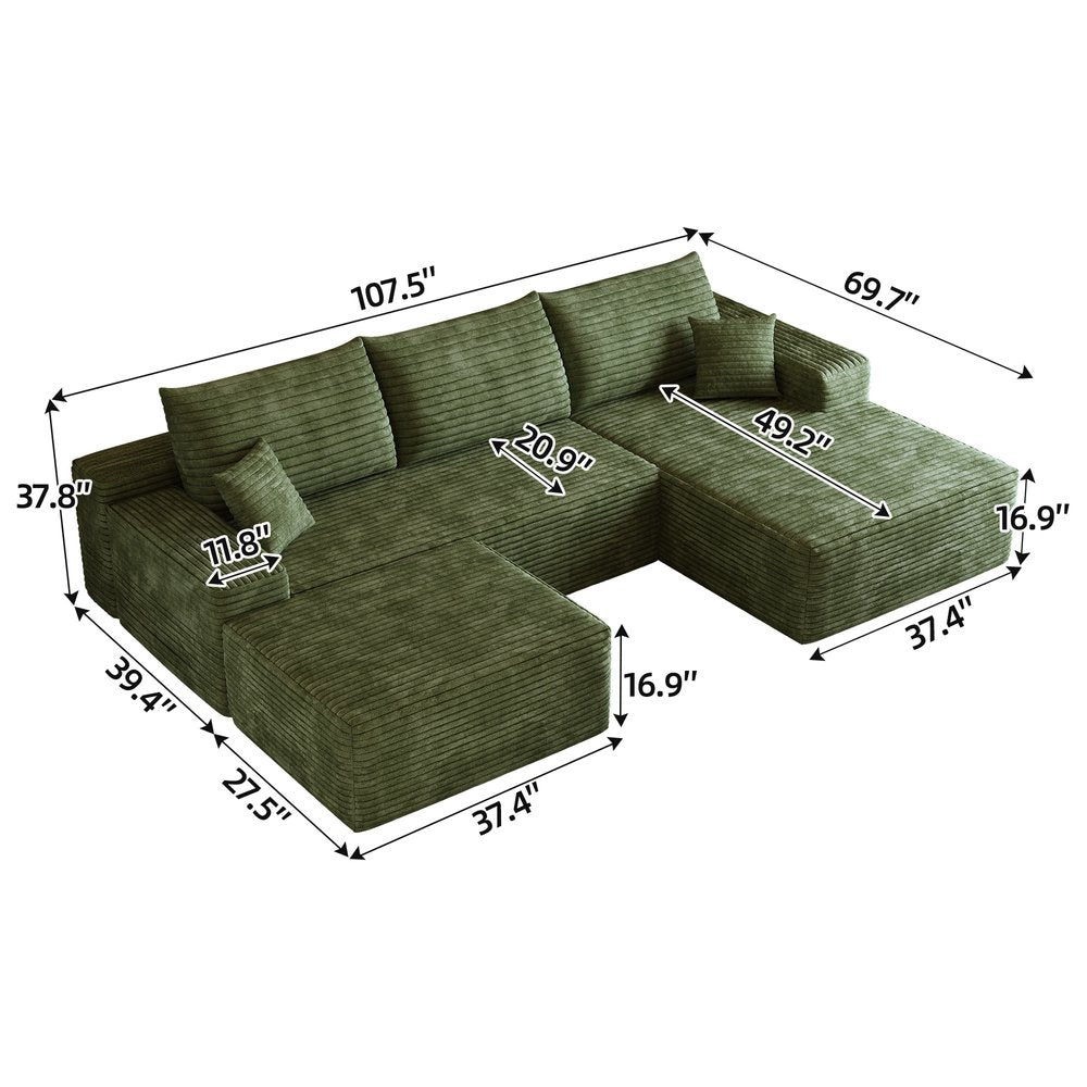 107" Green Corduroy Modular Compression Foam Sofa With Ottoman And Toss Pillows