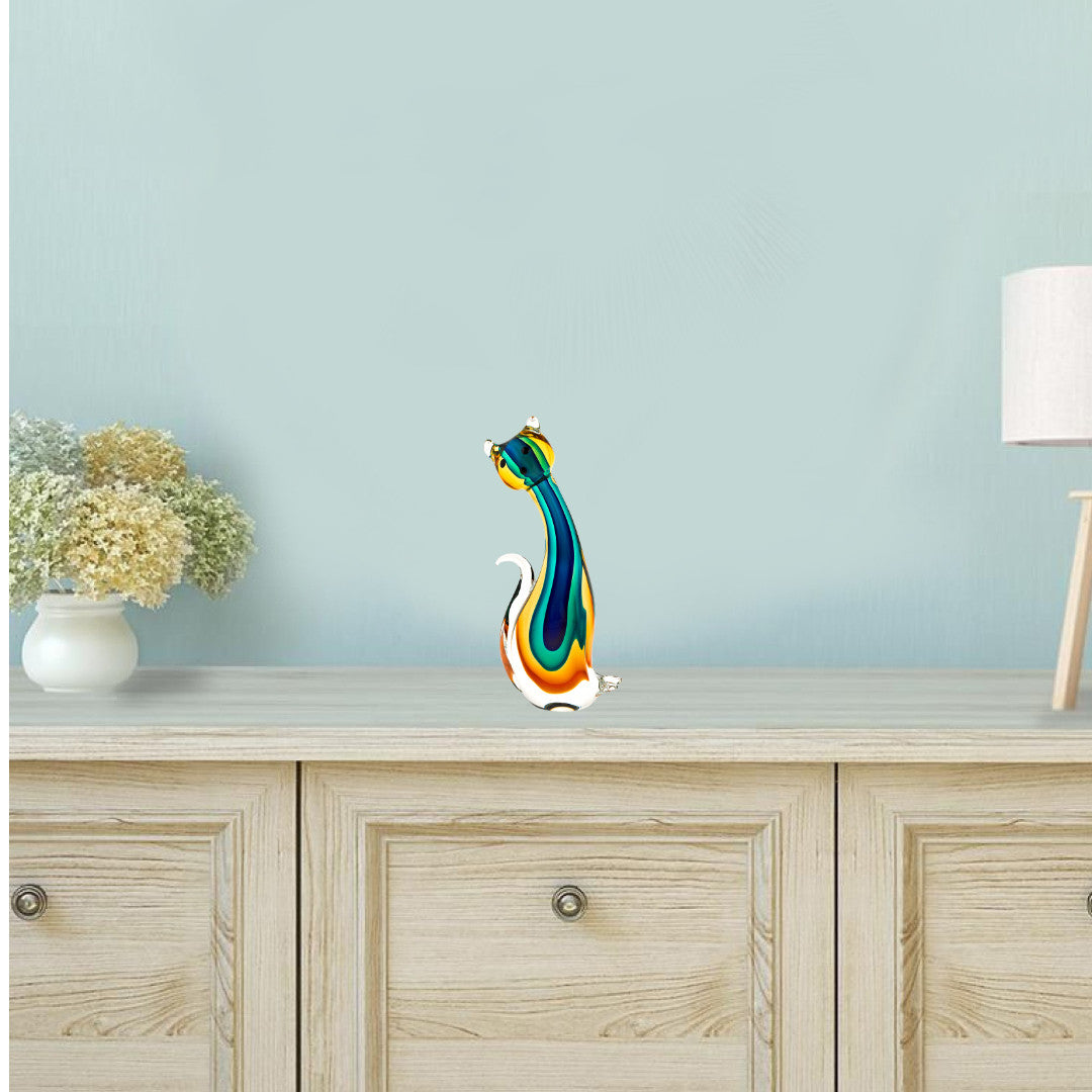 Unique and decorative, this 12-inch clear yellow green black murano glass cat figurine tabletop sculpture will leave a lasting impression....