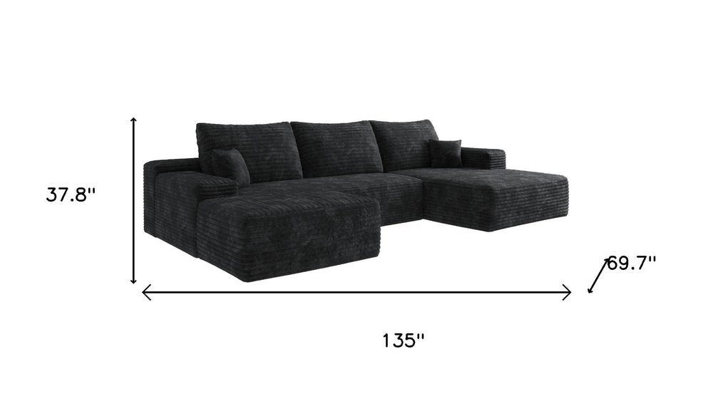 135" Black Corduroy Modular Compression Foam Sofa With Ottoman And Toss Pillows