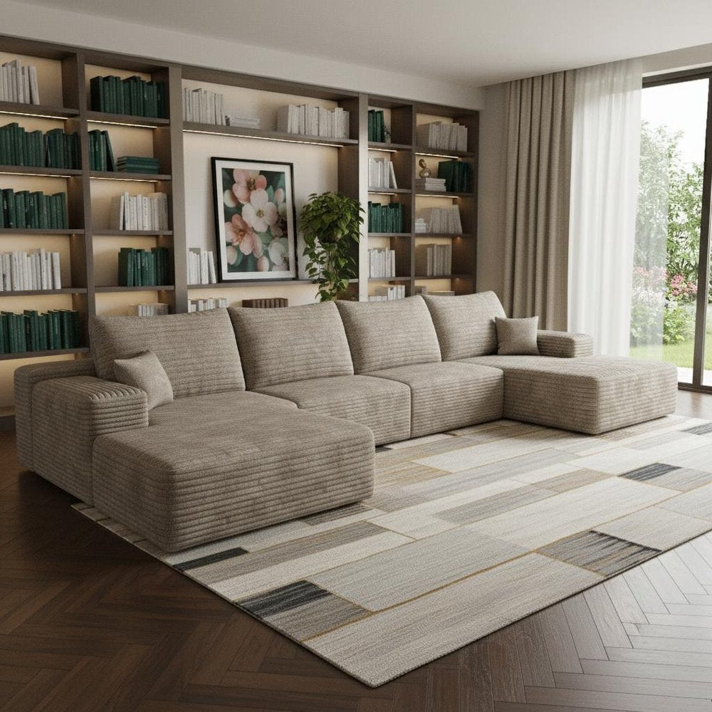 135" Camel Corduroy Modular Compression Foam Sofa With Ottoman And Toss Pillows