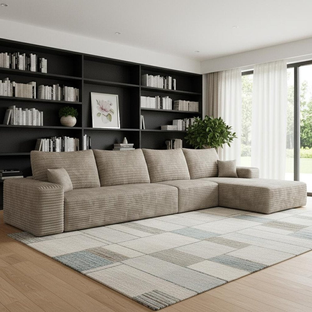 Transform your home's interior with this luxurious 135-inch camel corduroy modular compression foam sofa with toss pillows. This solid color...