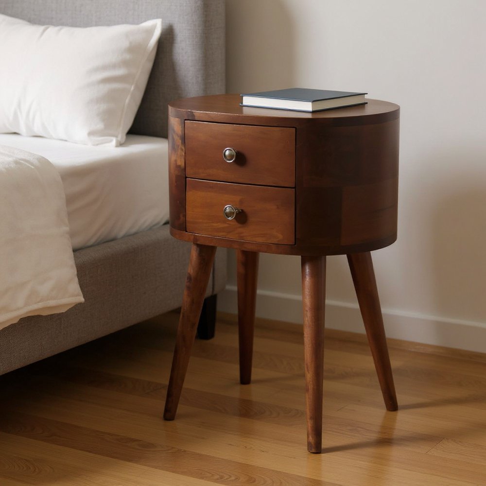 20" Brown Solid Wood Oval Distressed Two Drawer Nightstand