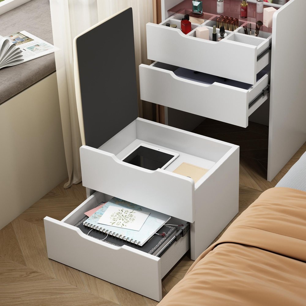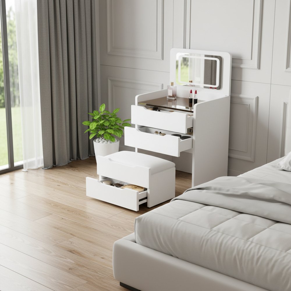 24" White Wood Lighted Mirrored Three Drawer Dresser
