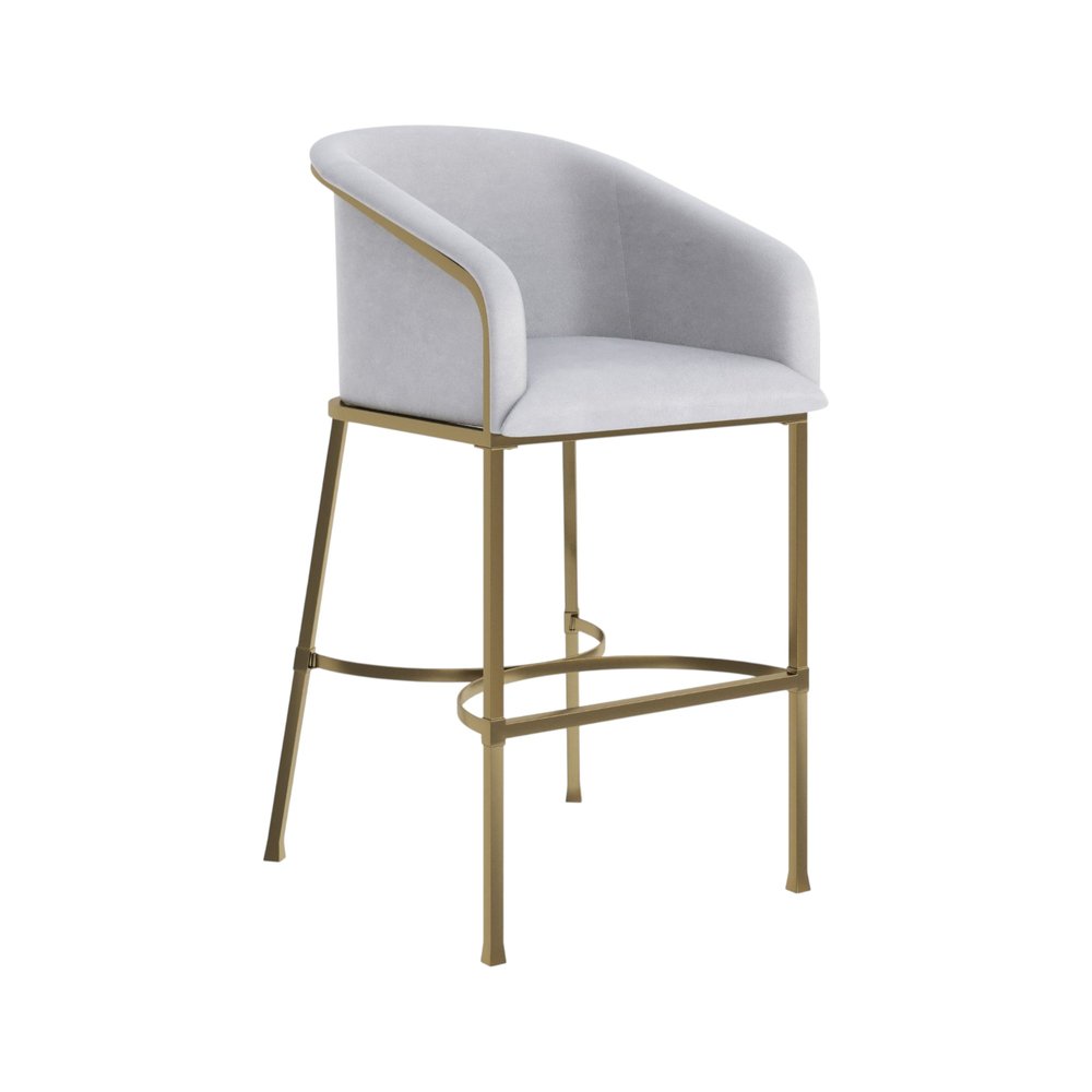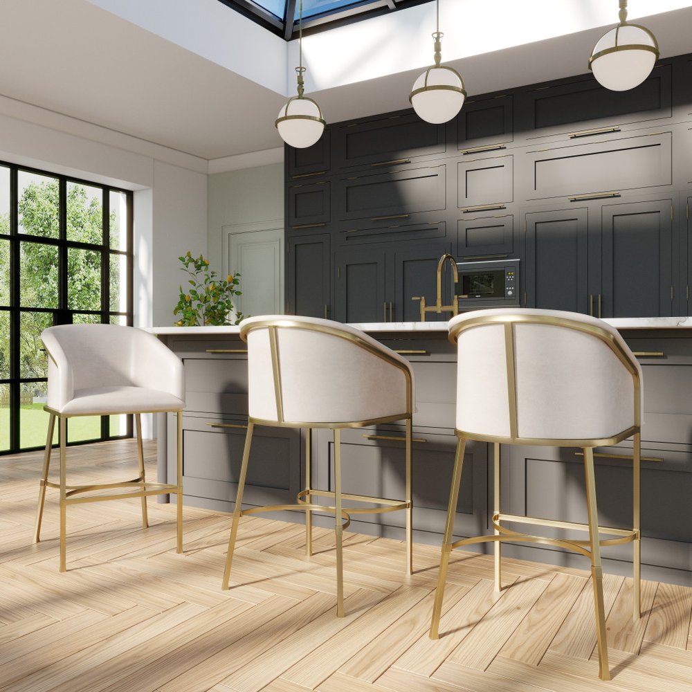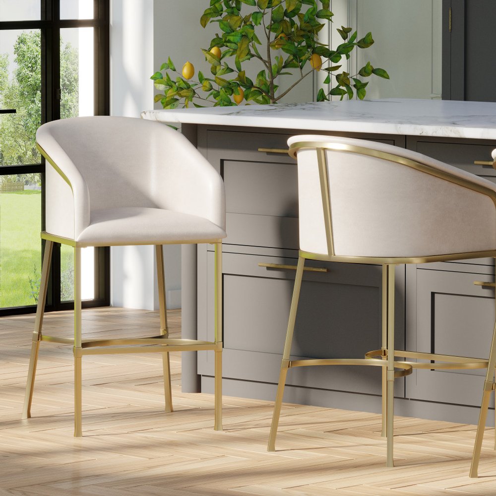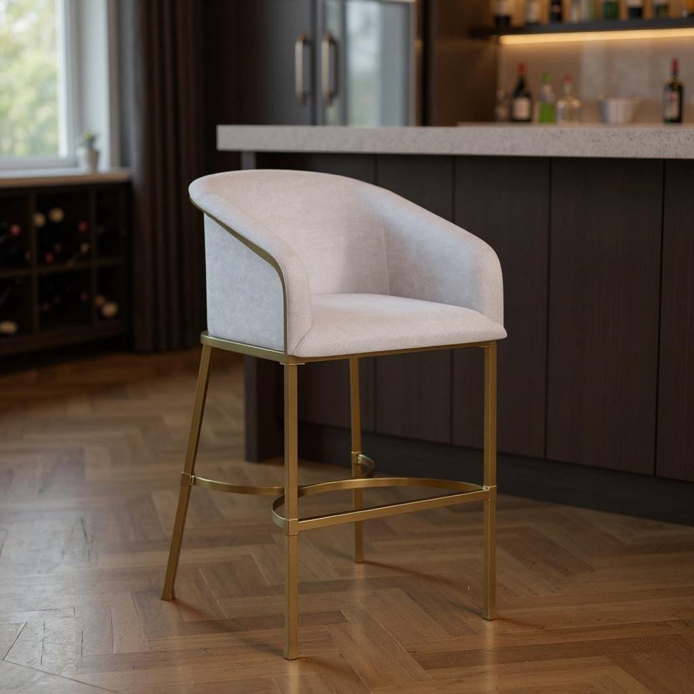 Comfortable enough to sit in for awhile, this 31-inch white and gold wood fabric and steel low back bar height... Read more