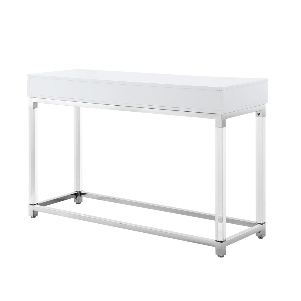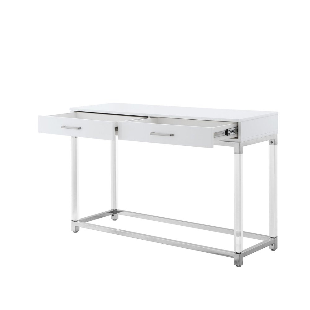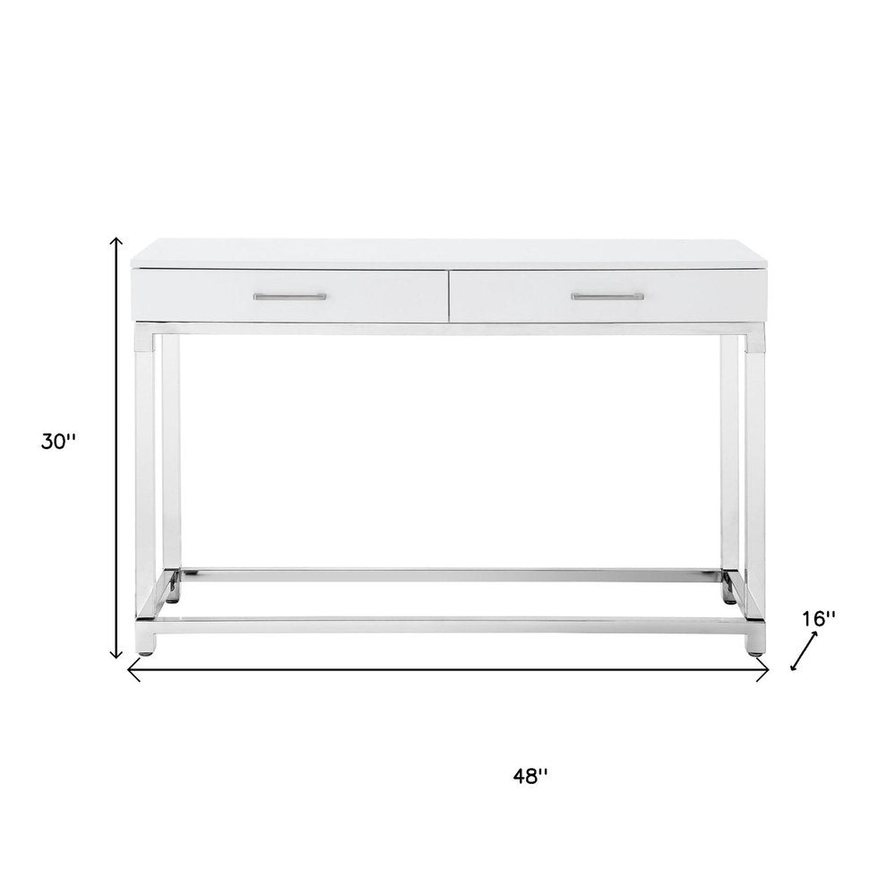 48" White and Silver Wood and Stainless Steel Console Table And With Two Drawers