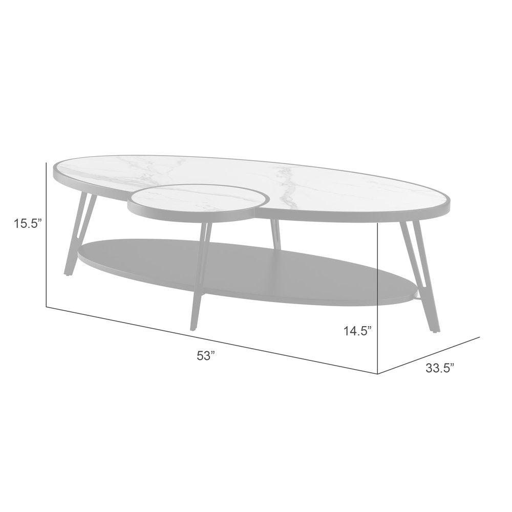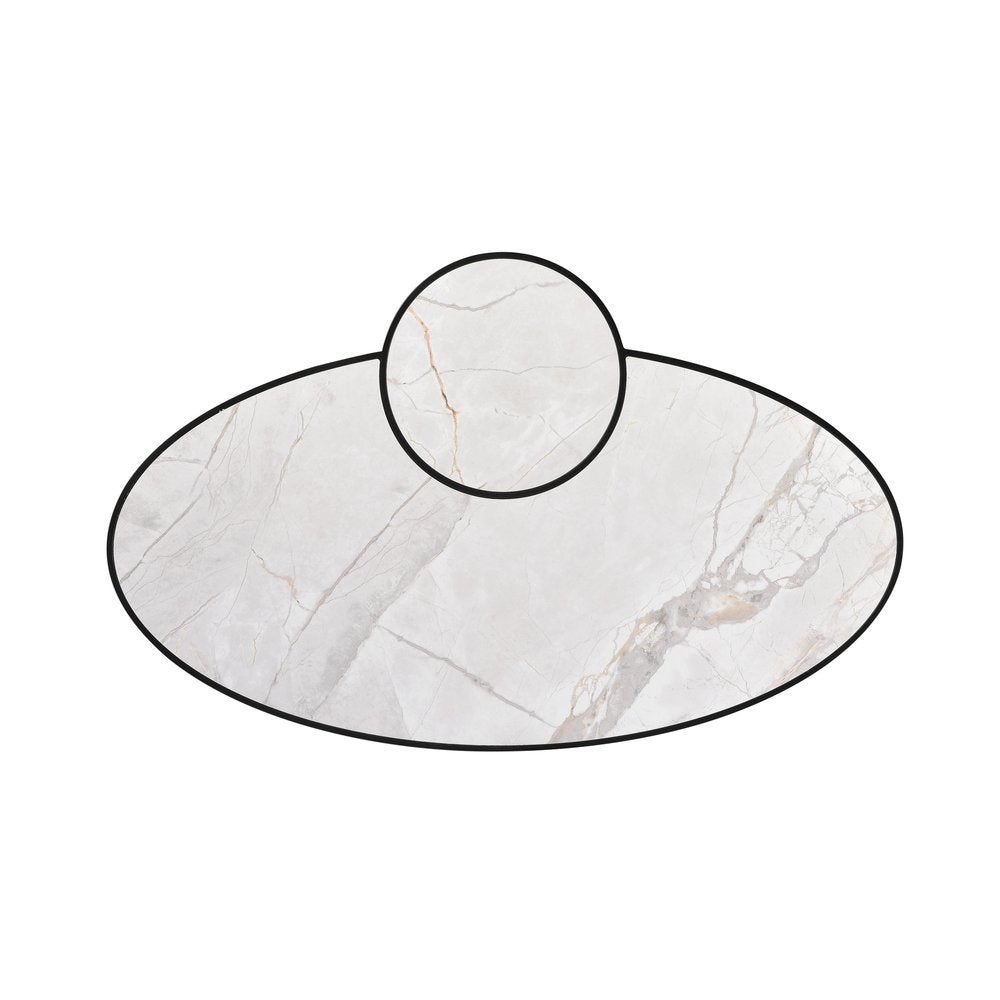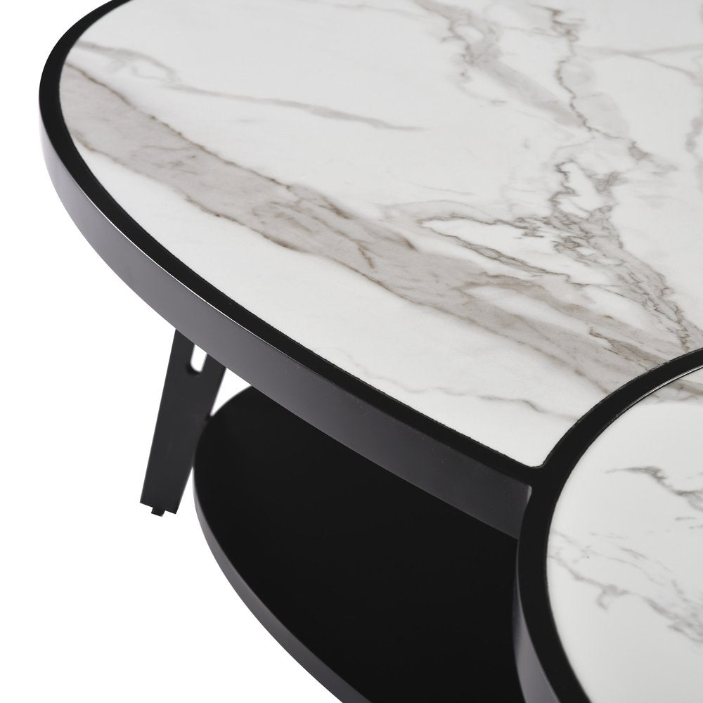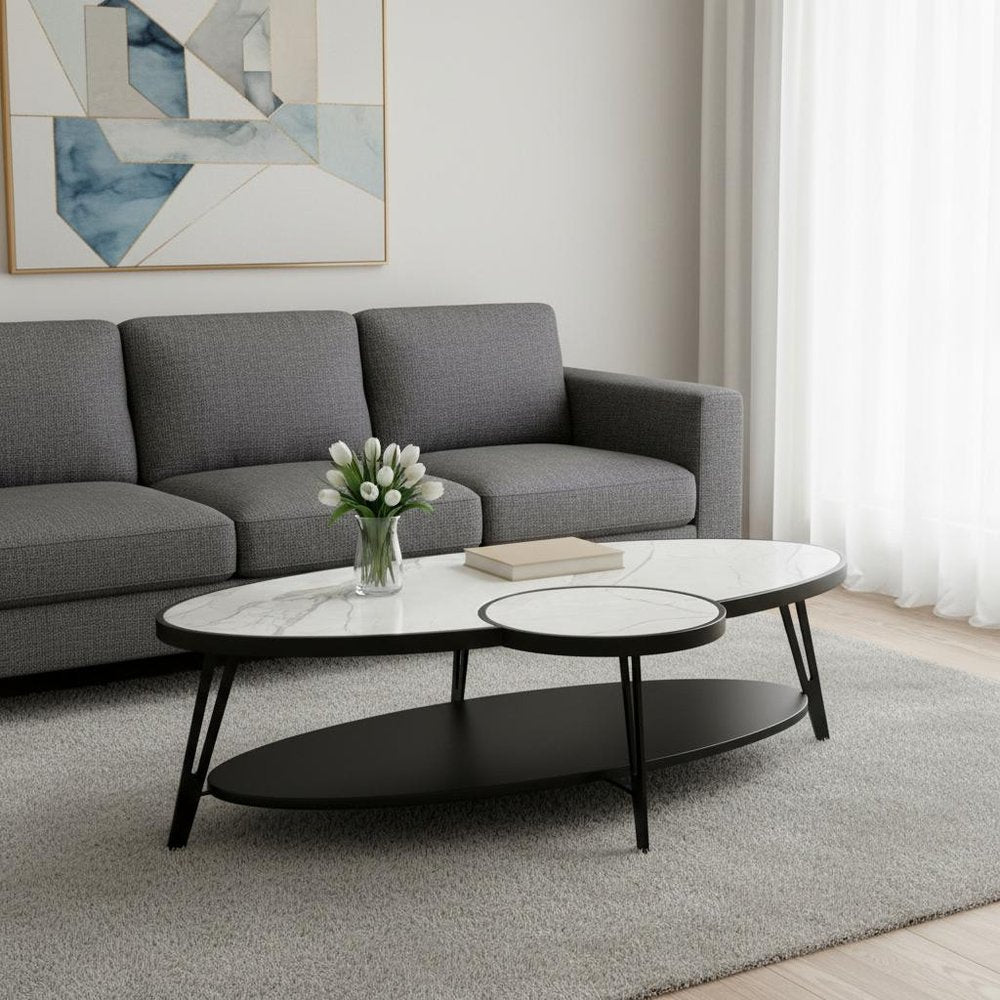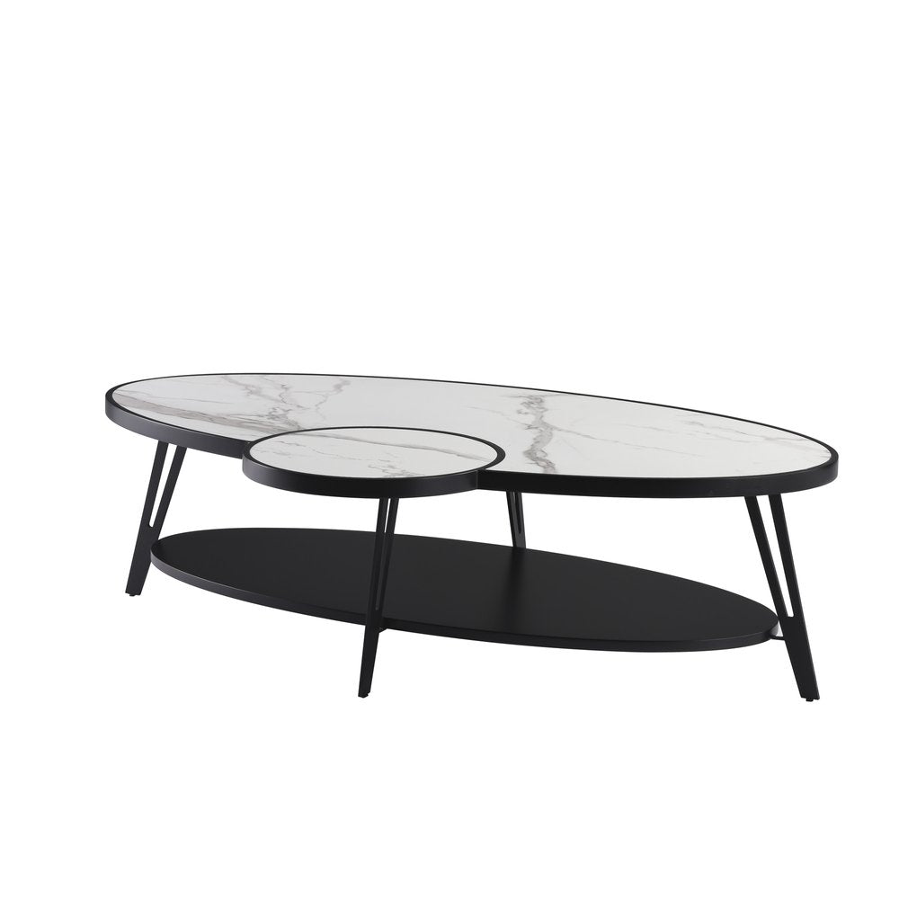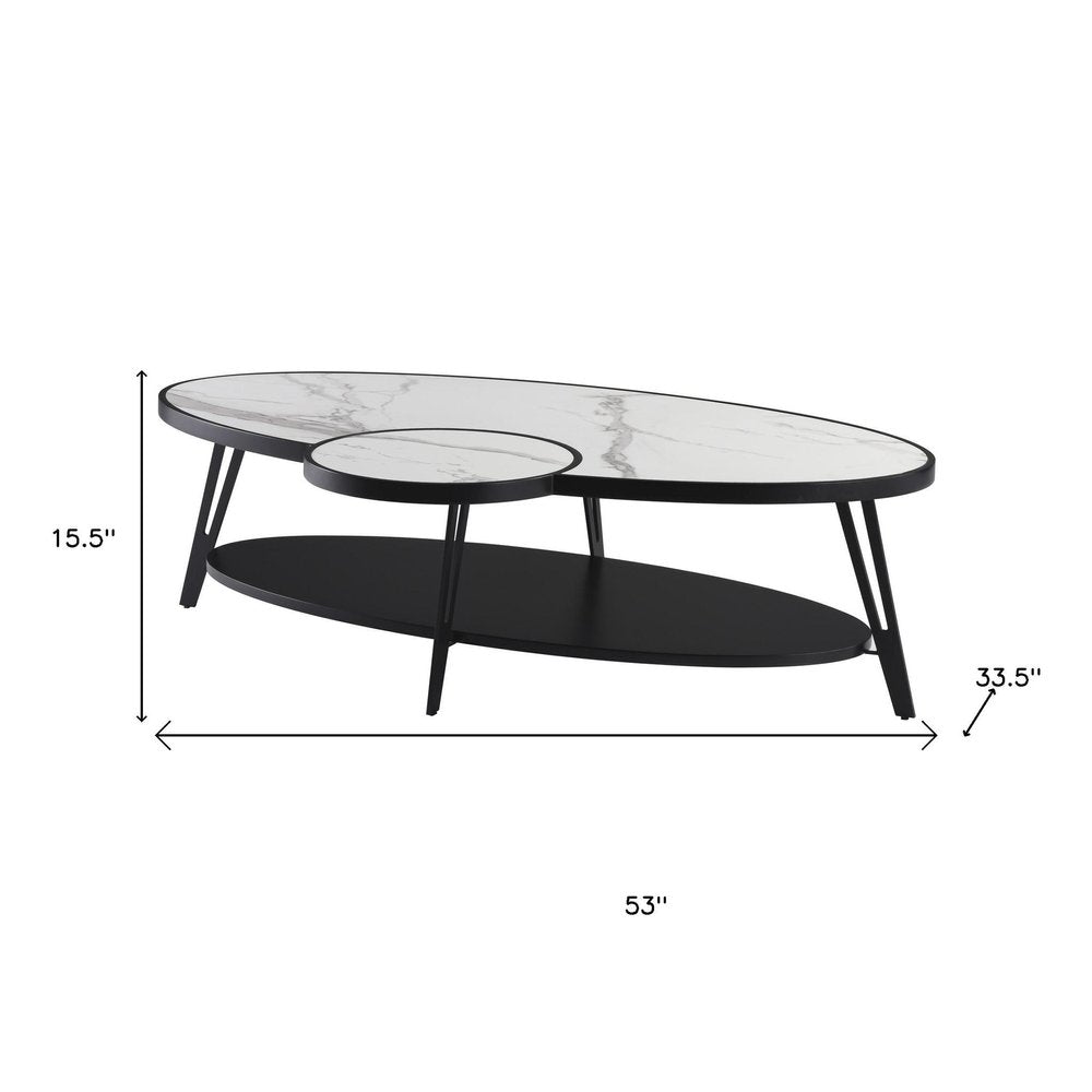 53" White and Black Sintered Stone and Iron Oval Coffee Table With Shelf
