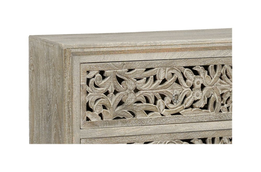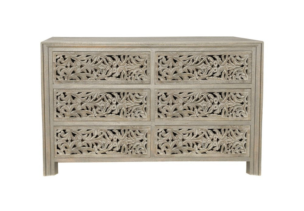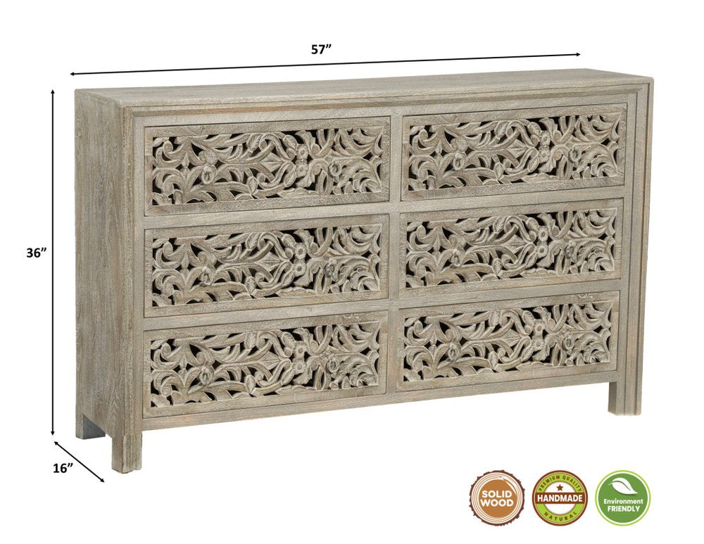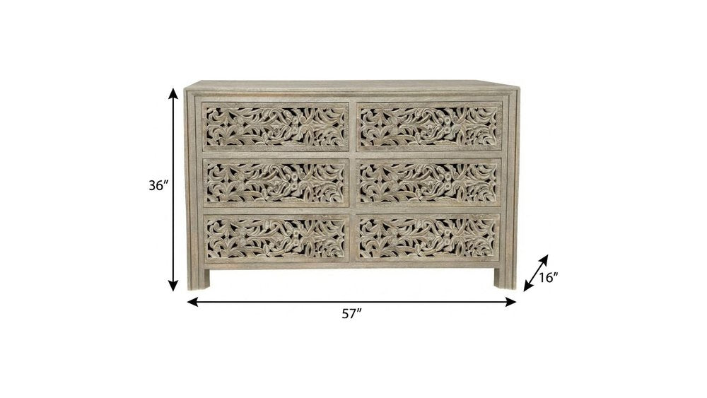 57" Gray Carved Scrollwork Solid Wood Six Drawer Dresser