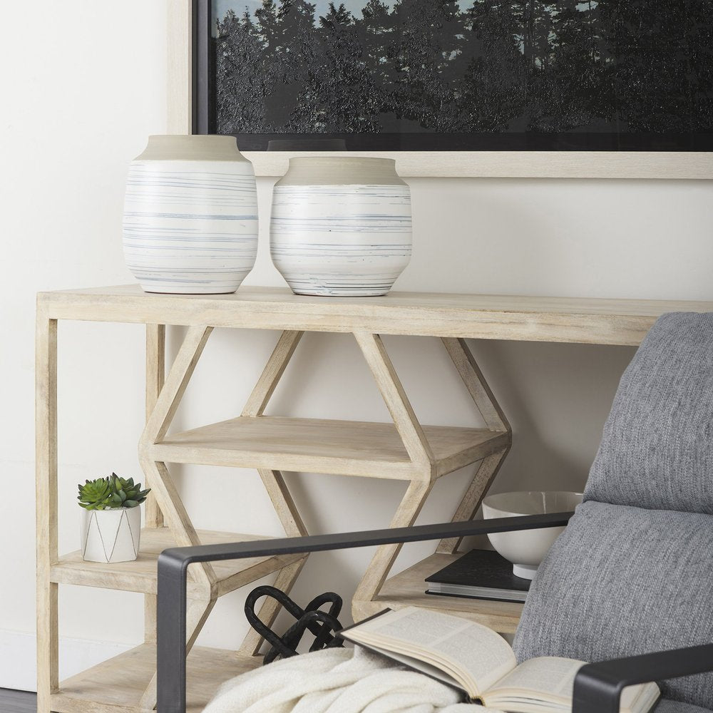 Add a touch of modern elegance to your space with this 9-inch white blue and sand abstract cylinder ceramic table... Read more