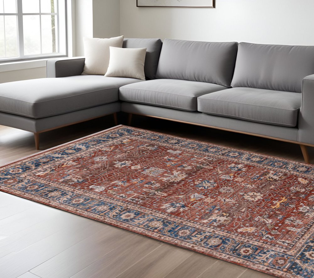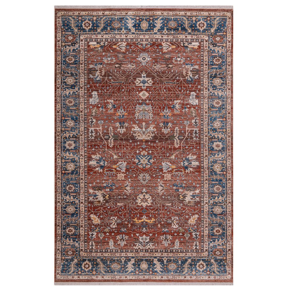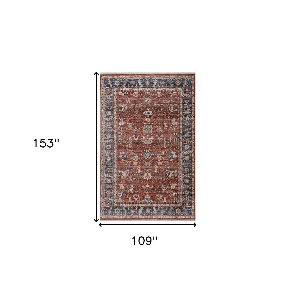 9' X 13' Red Beige And Blue Oriental Area Rug With Fringe