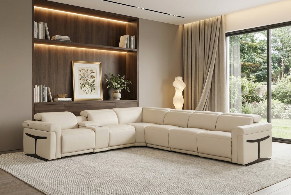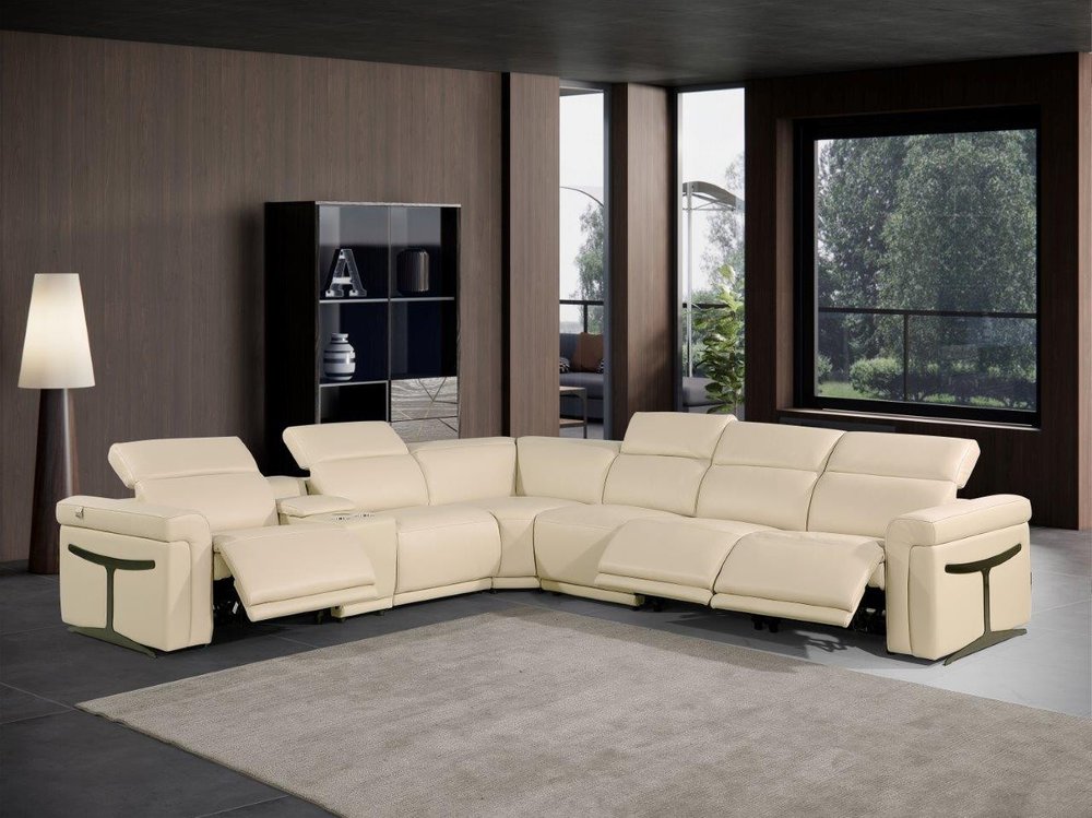 Beige Italian Leather Modular L Shaped Seven Piece Corner Sectional With Console