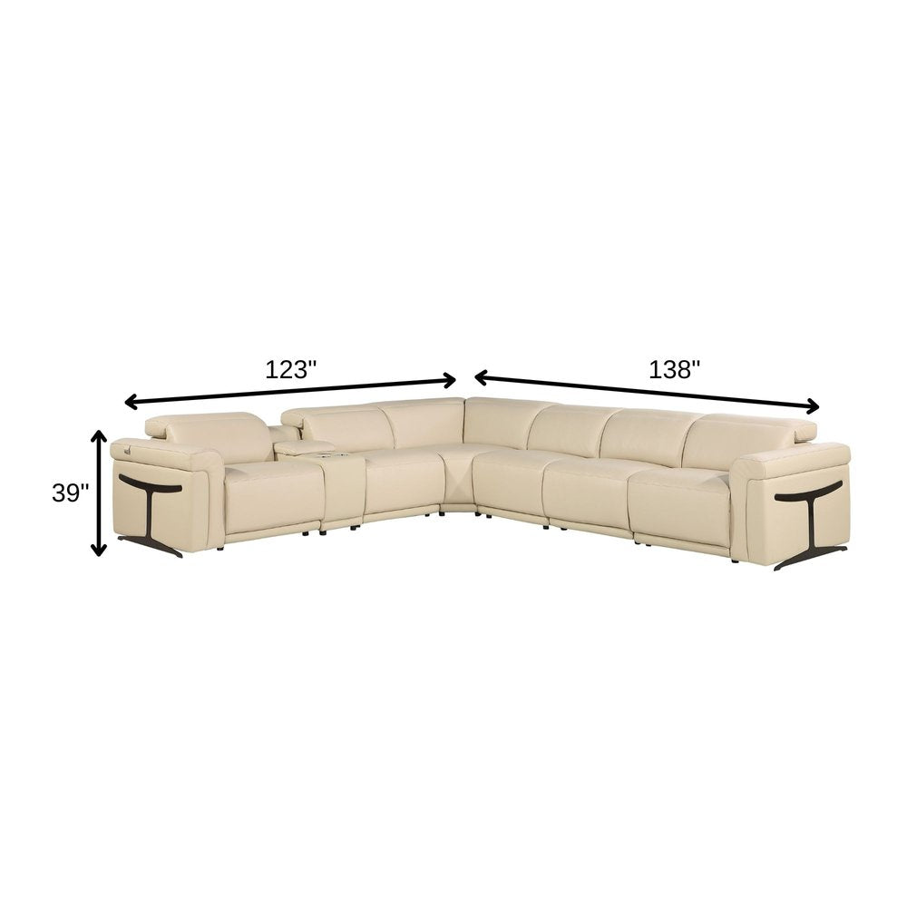 Beige Italian Leather Modular L Shaped Seven Piece Corner Sectional With Console