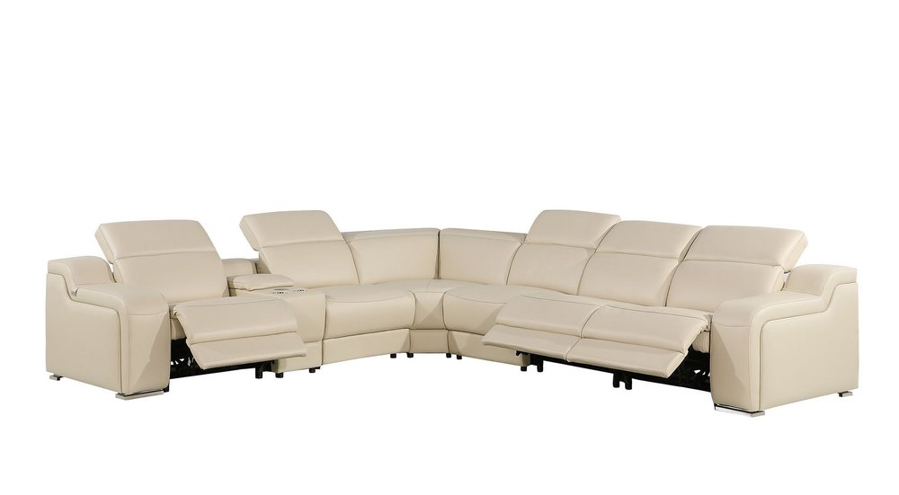 Beige Italian Leather Power Reclining Curved Seven Piece Corner Sectional With Console