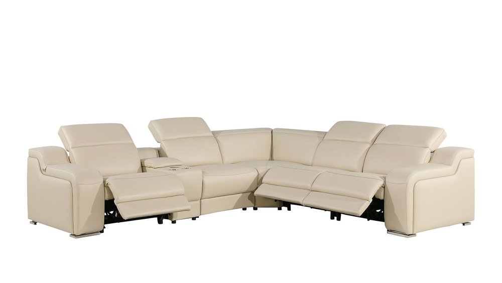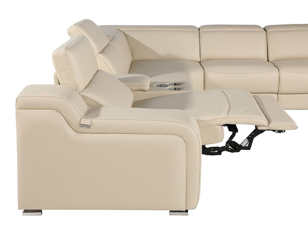 Beige Italian Leather Power Reclining Curved Six Piece Corner Sectional With Console