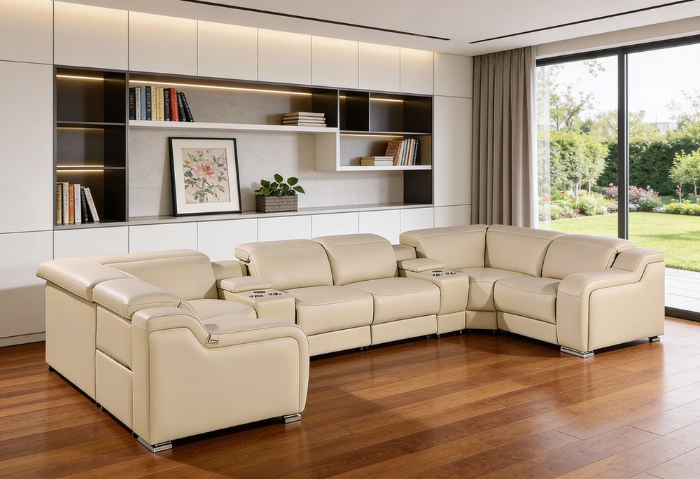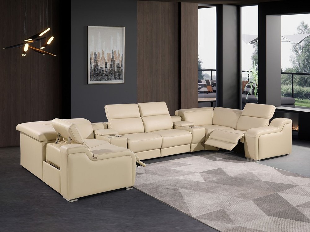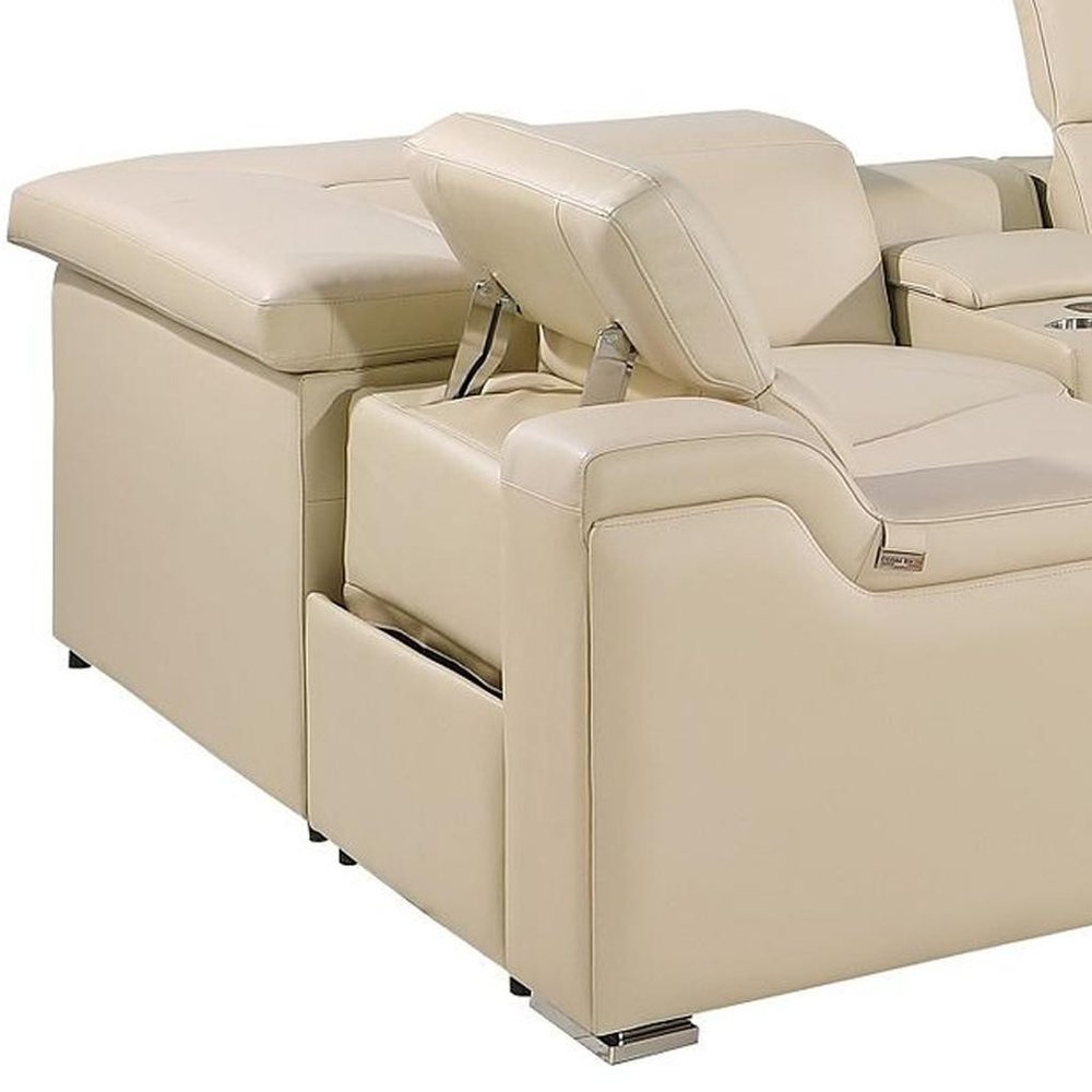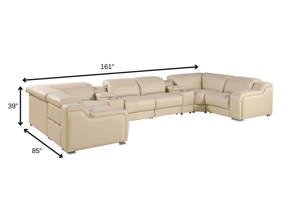 Beige Italian Leather Power Reclining U Shaped Eight Piece Corner Sectional With Console