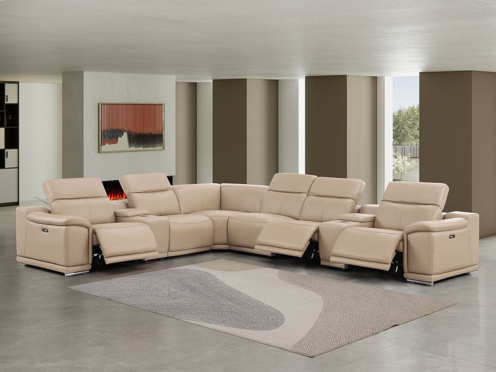 Beige Leather Modular L Shaped Eight Piece Corner Sectional With Console