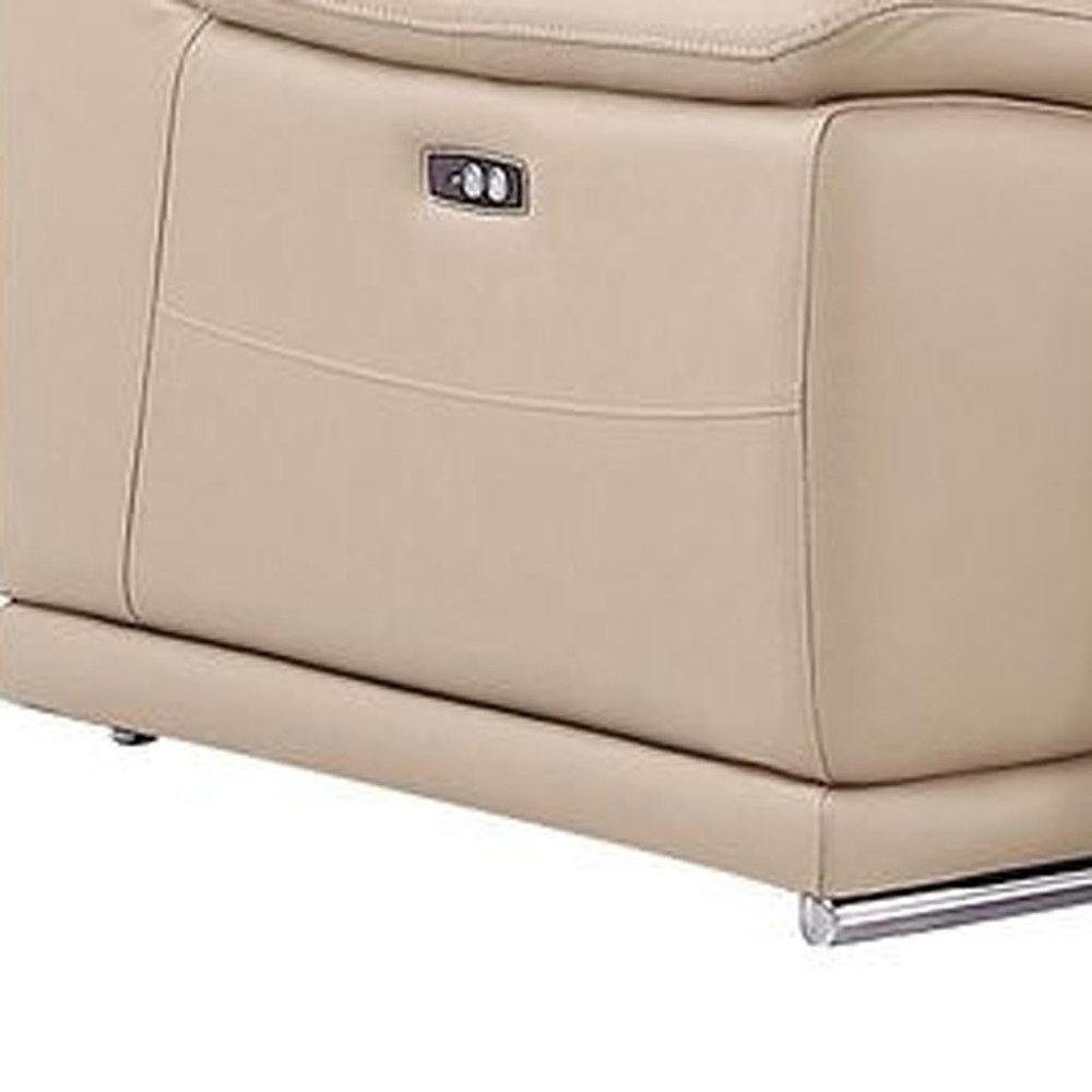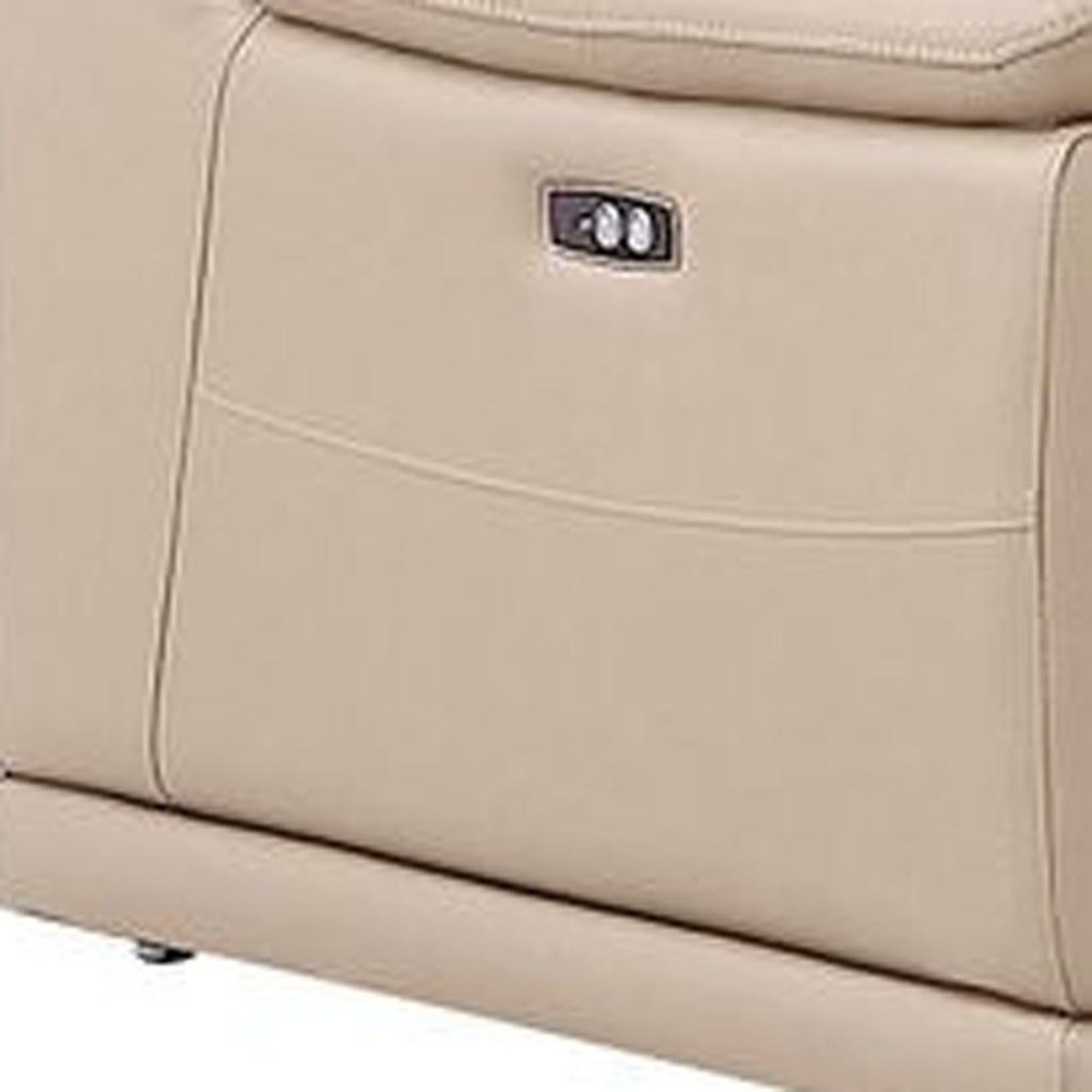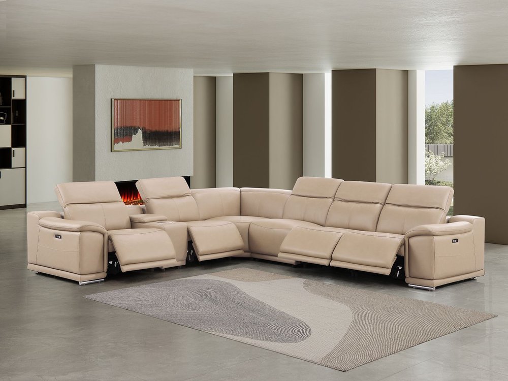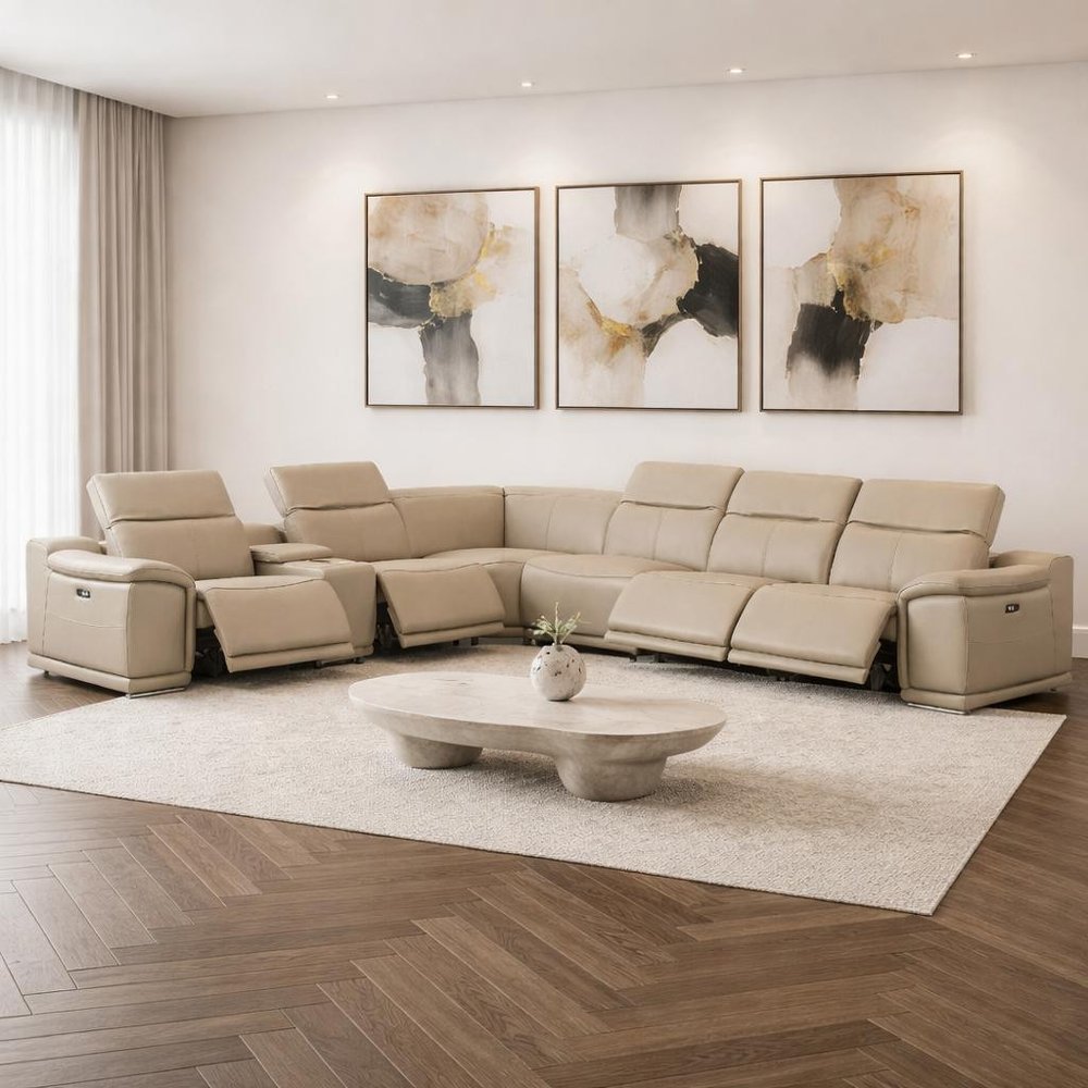 Beige Leather Power Reclining L Shaped Seven Piece Corner Sectional With Console