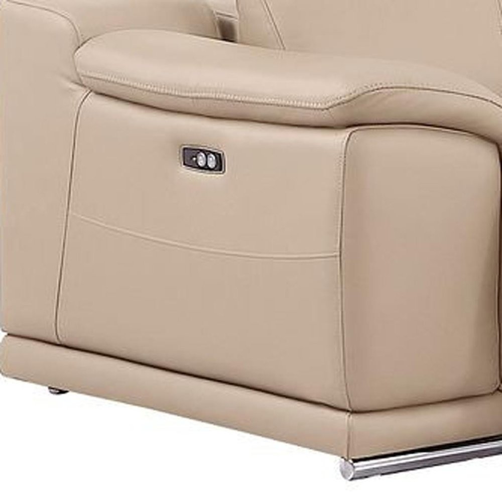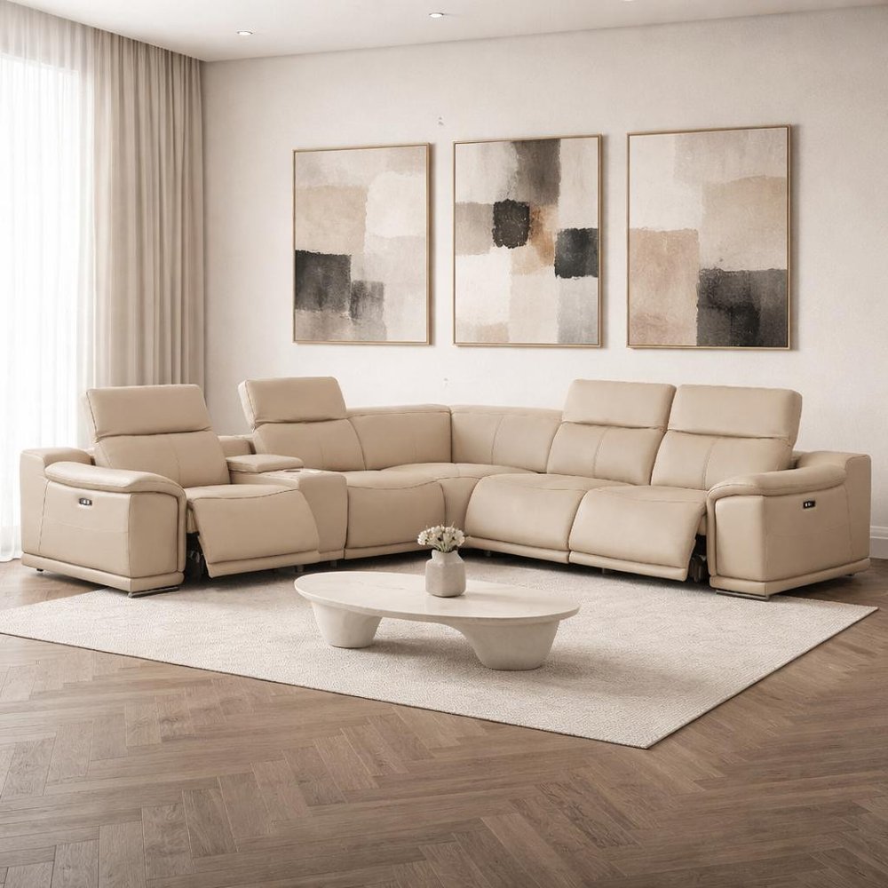 Beige Leather Modular L Shaped Six Piece Corner Sectional With Console