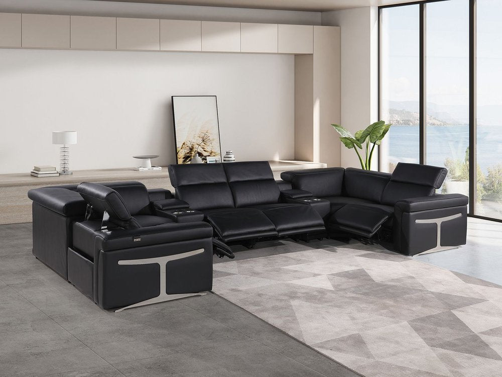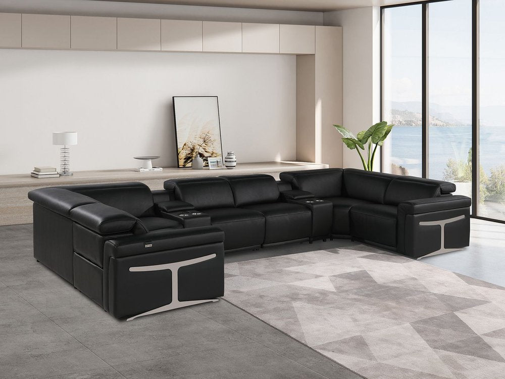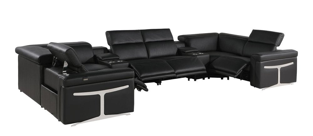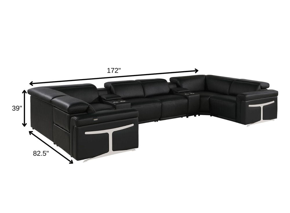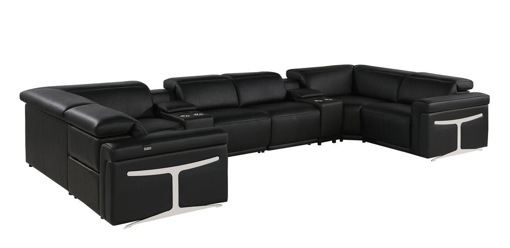 Black Italian Leather Power Reclining U Shaped Eight Piece Sectional With Console