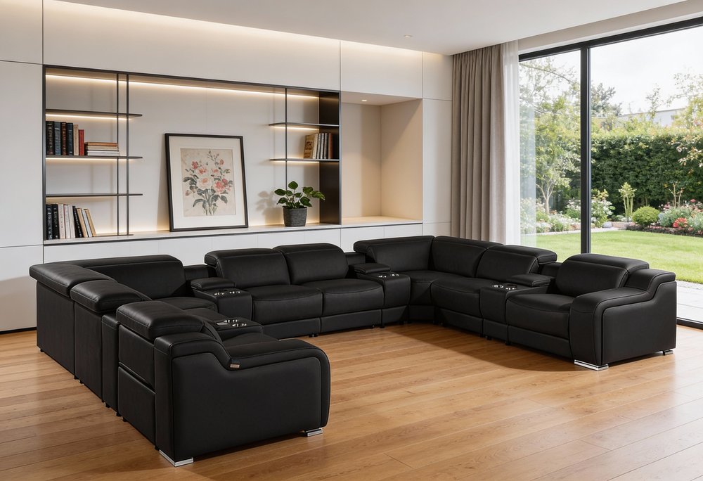 An interior designer's dream, this buttery soft high-grade leather black italian leather power reclining u shaped twelve piece corner sectional...