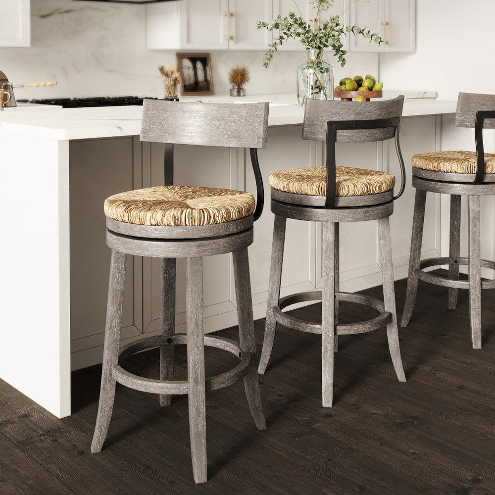 Brown and Gray Rattan and Solid Wood Low Back Bar Height Swivel Bar Chair