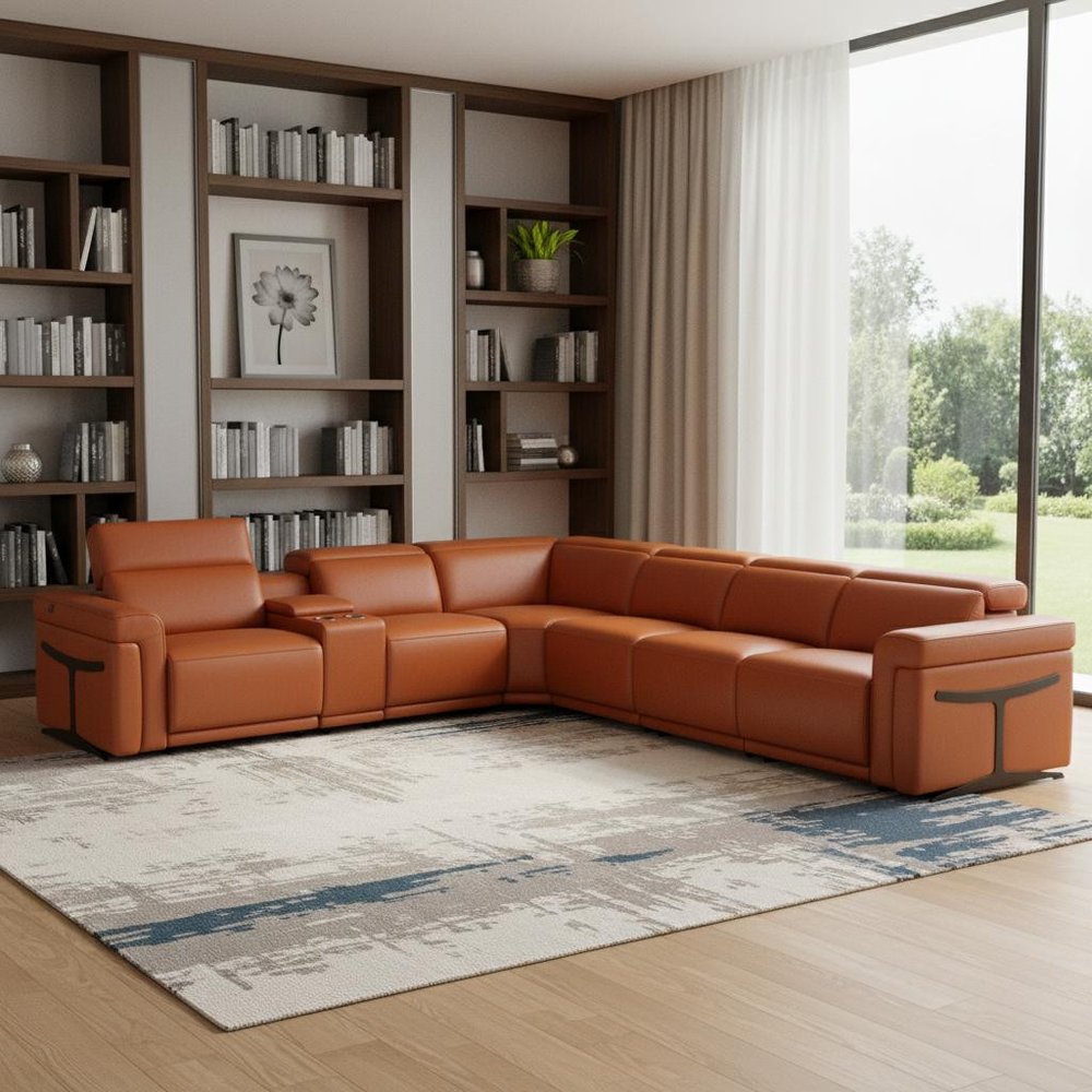 Camel Italian Leather Modular L Shaped Seven Piece Corner Sectional With Console