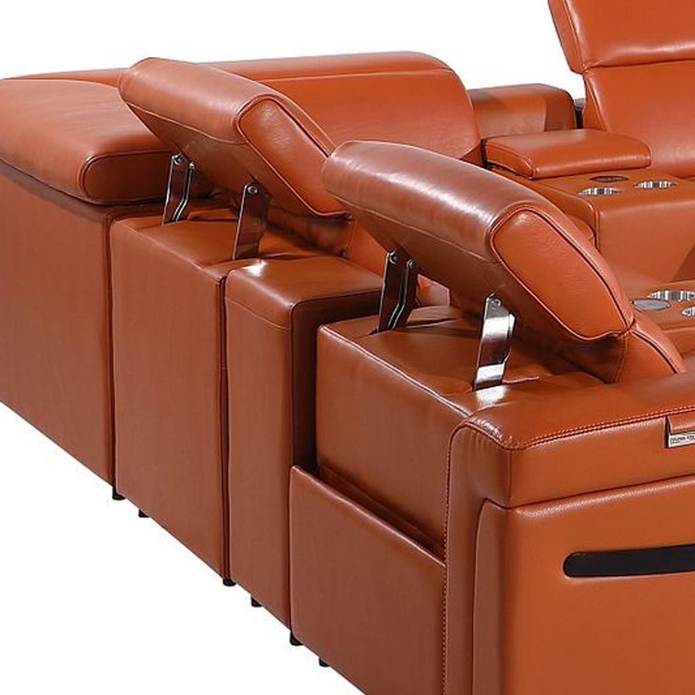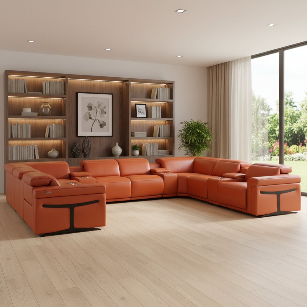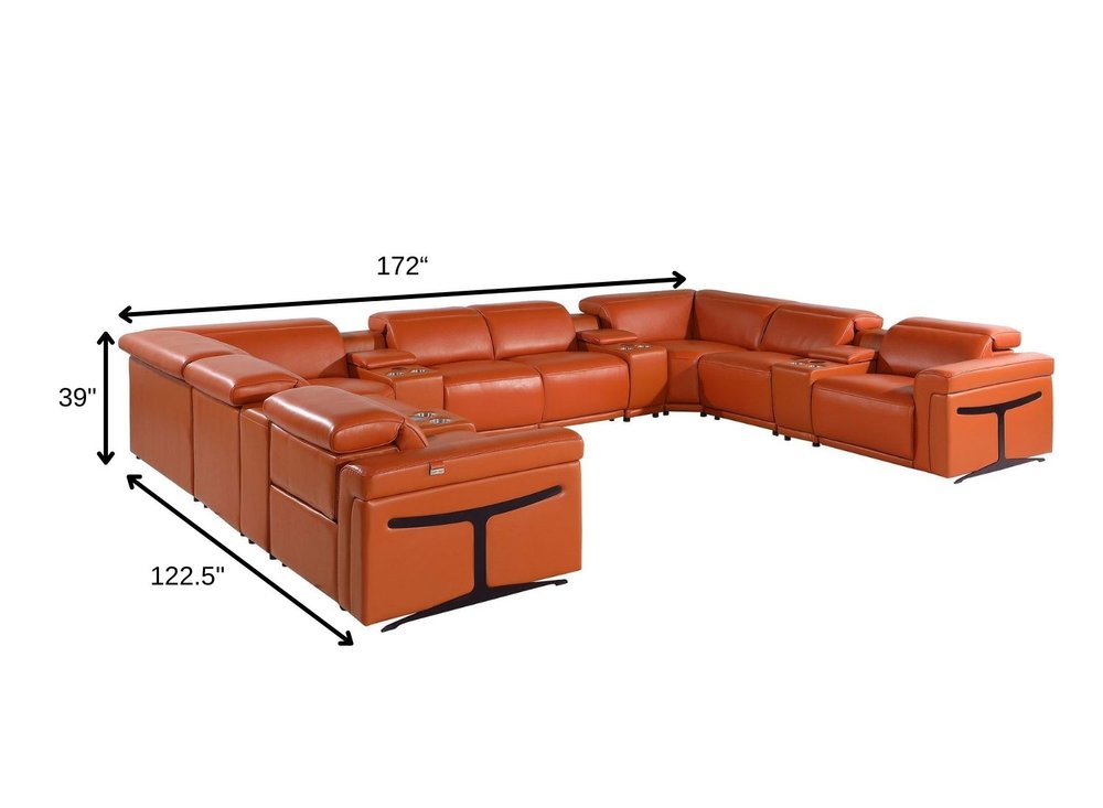 Camel Italian Leather Power Reclining U Shaped Twelve Piece Sectional With Console