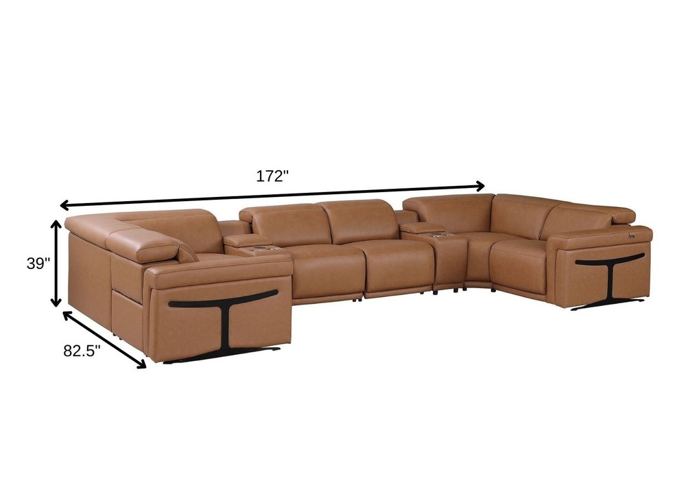 Chestnut Italian Leather Power Reclining U Shaped Eight Piece Sectional With Console