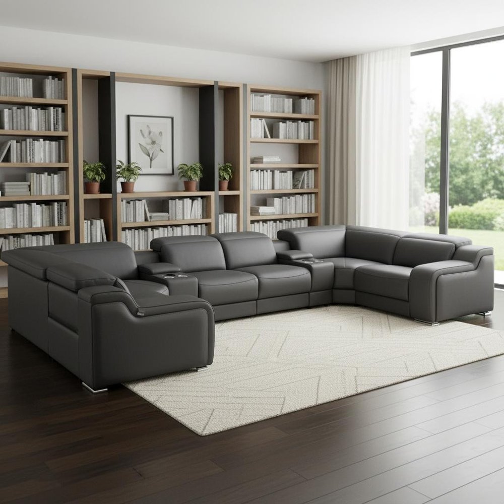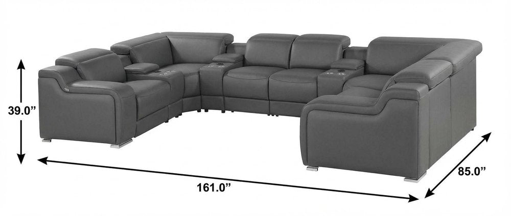 Dark Gray Italian Leather Power Reclining U Shaped Eight Piece Corner Sectional With Console