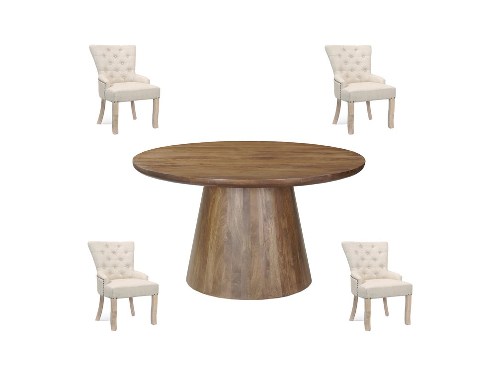 Five Piece Brown Round Solid Wood Dining Set with Four Chairs