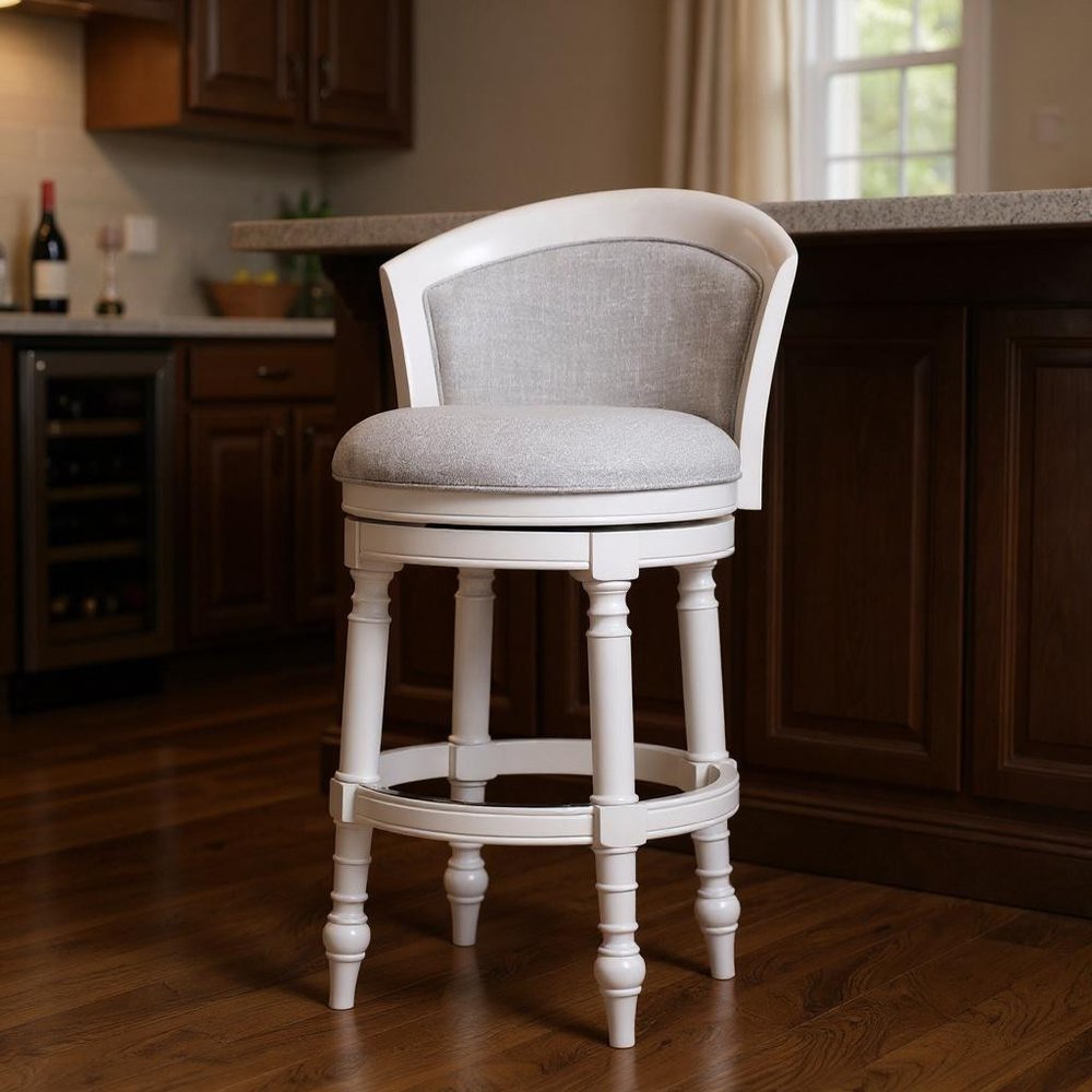 Comfortable enough to sit in for awhile, this gray and white fabric and solid wood low back bar height swivel... Read more