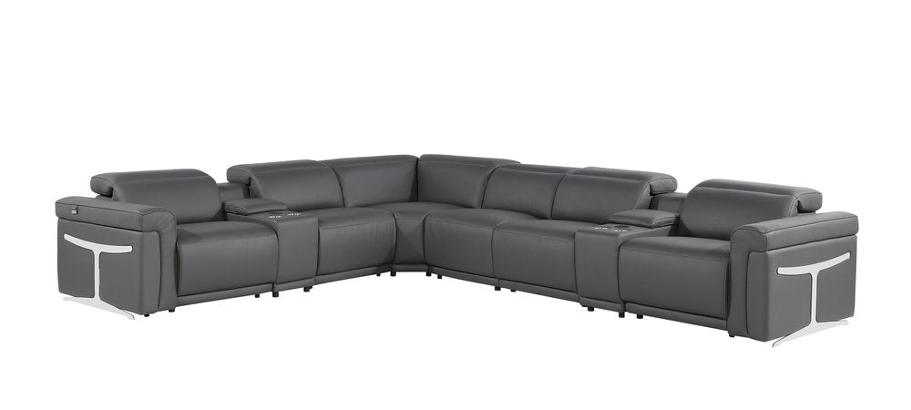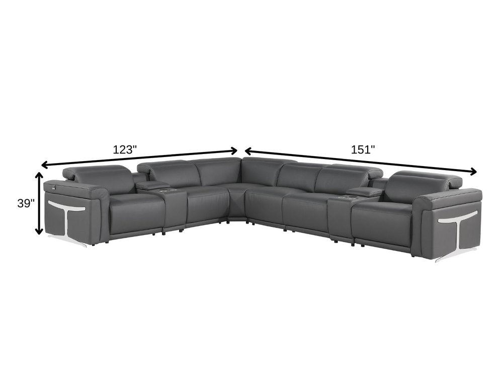Gray Italian Leather Modular L Shaped Eight Piece Corner Sectional With Console