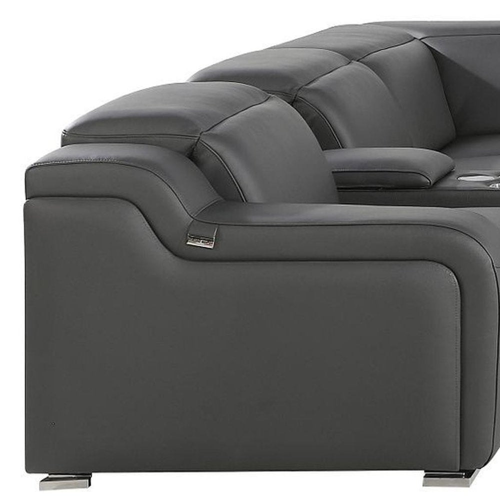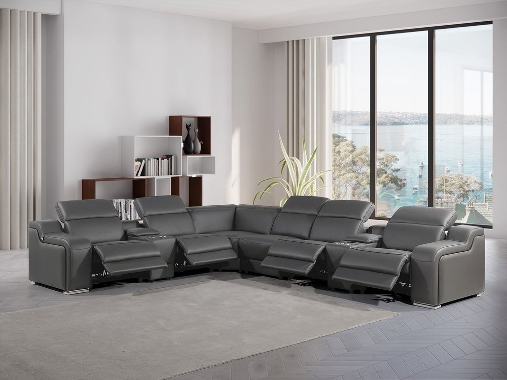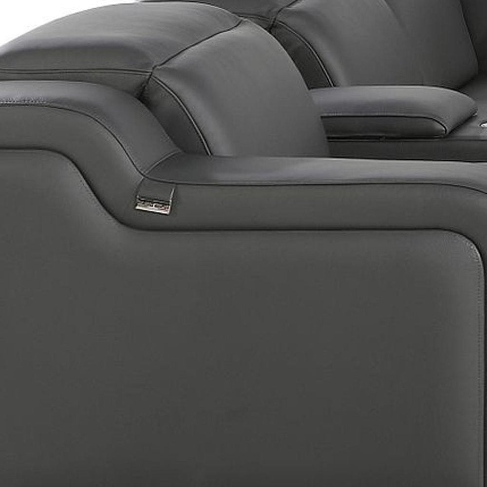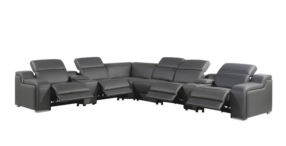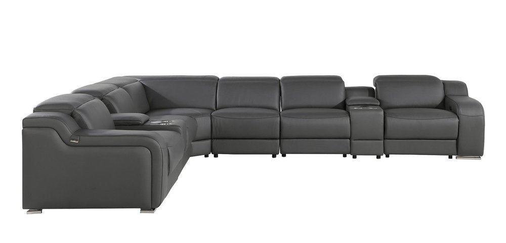 Gray Italian Leather Power Reclining Curved Eight Piece Corner Sectional With Console