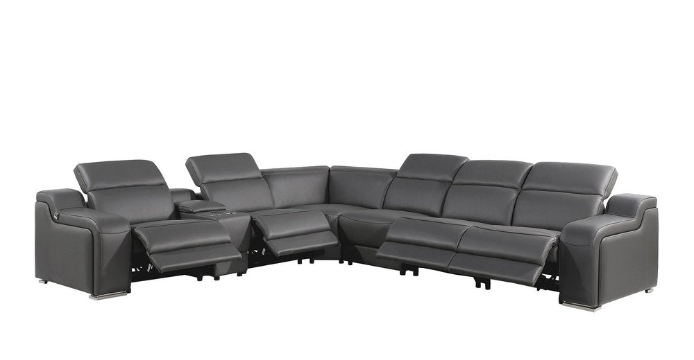 Gray Italian Leather Power Reclining Curved Seven Piece Corner Sectional With Console