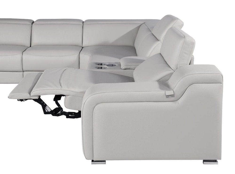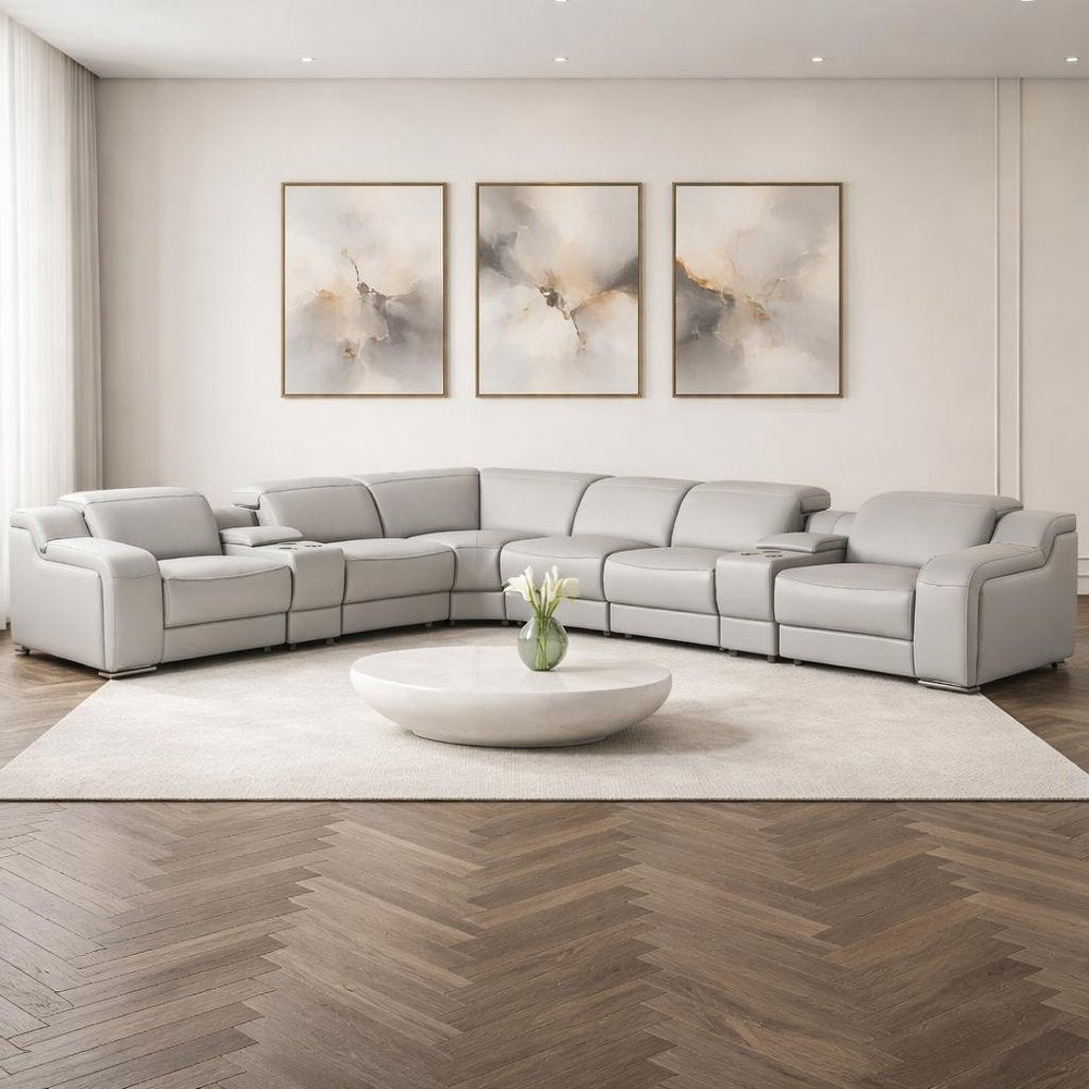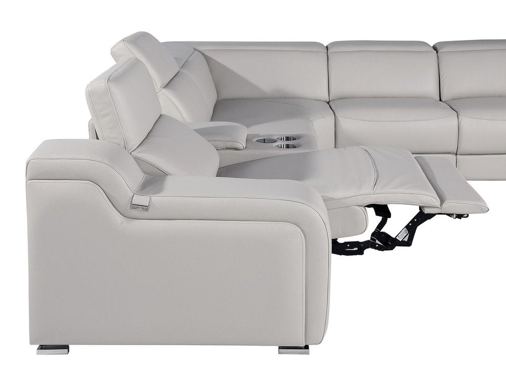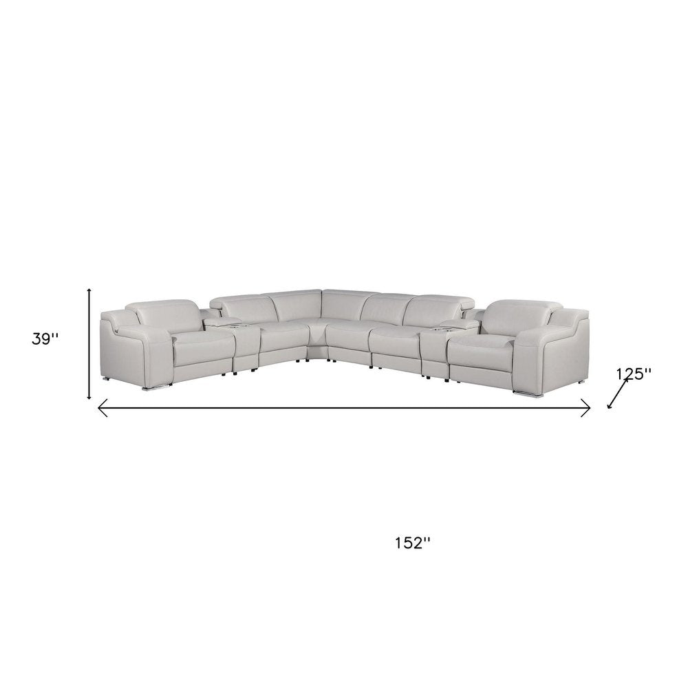 Light Gray Italian Leather Power Reclining Curved Eight Piece Corner Sectional With Console