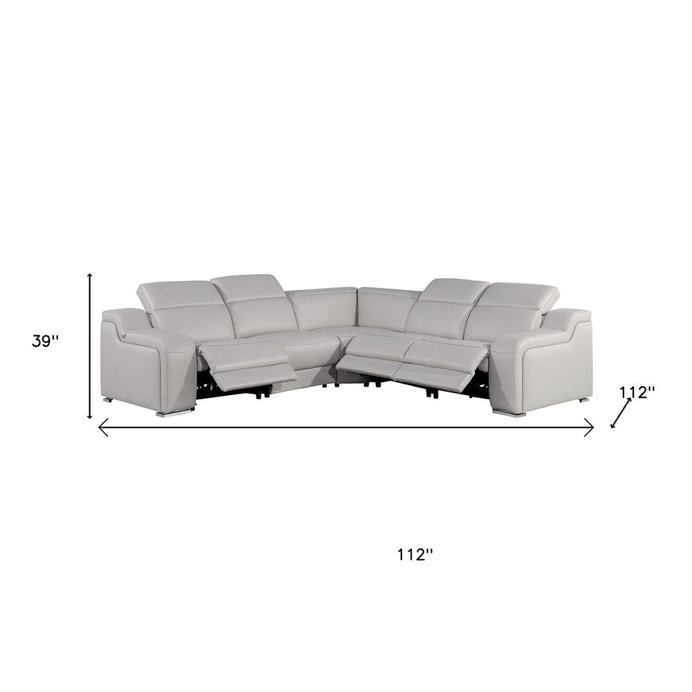 Light Gray Italian Leather Power Reclining Curved Five Piece Corner Sectional With Console
