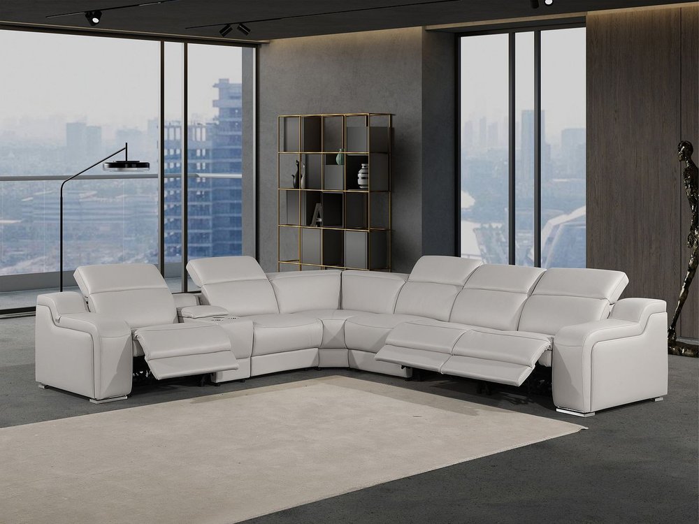 Made of the highest quality, supple leather, this light gray italian leather power reclining curved seven piece corner sectional with... Read more