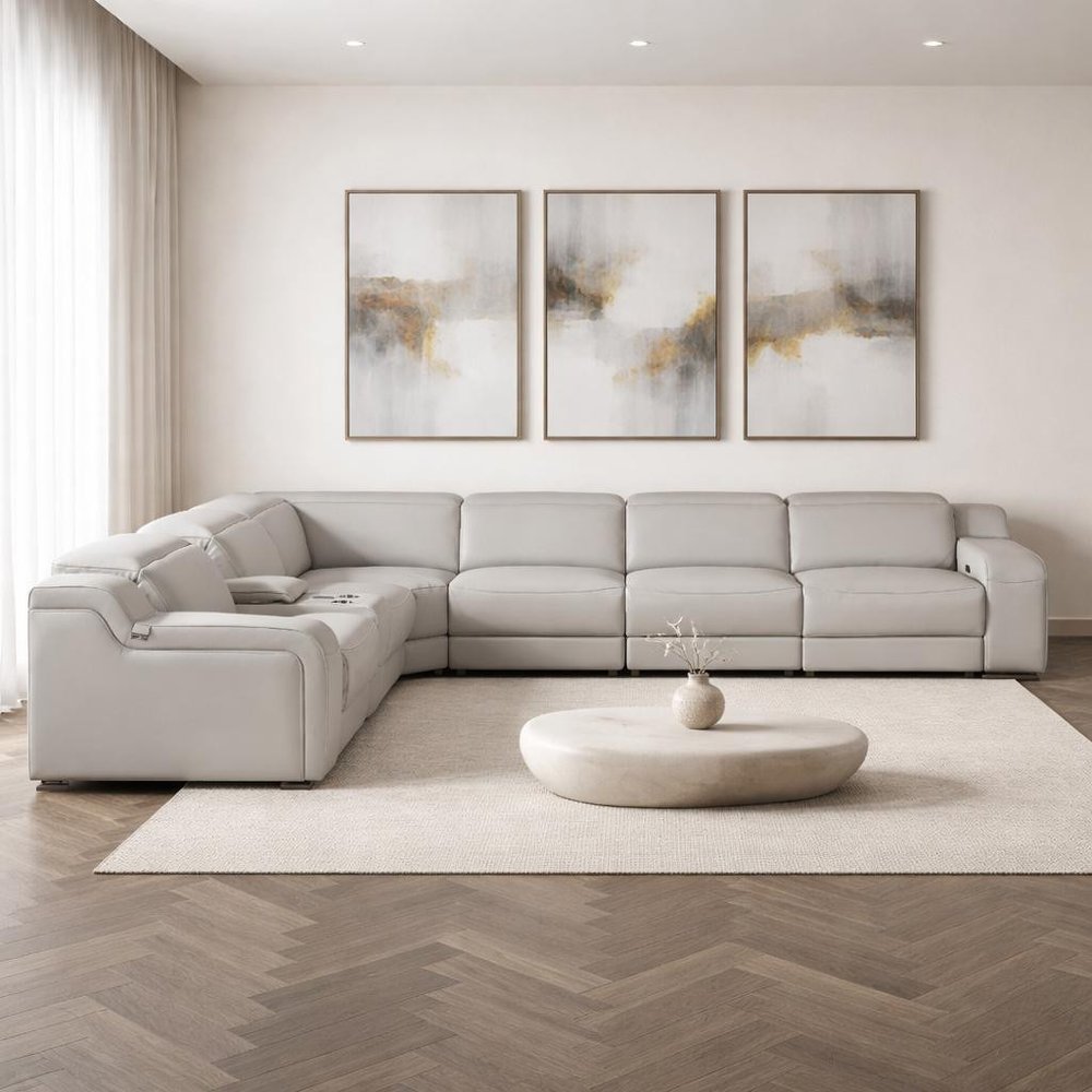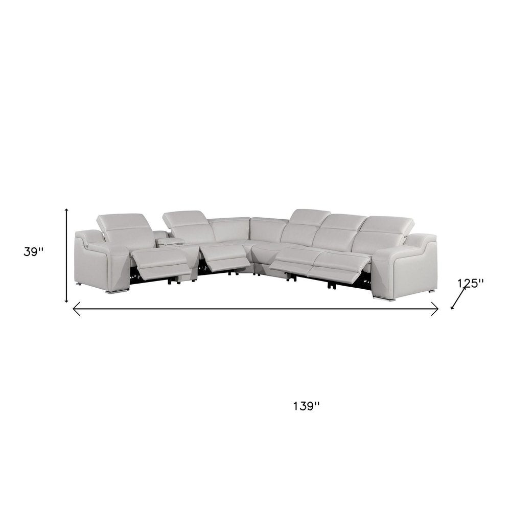 Light Gray Italian Leather Power Reclining Curved Seven Piece Corner Sectional With Console