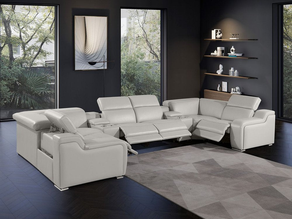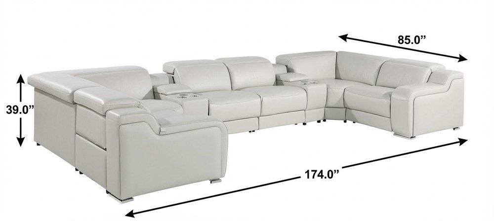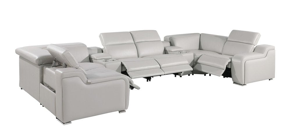Light Gray Italian Leather Power Reclining U Shaped Eight Piece Corner Sectional With Console