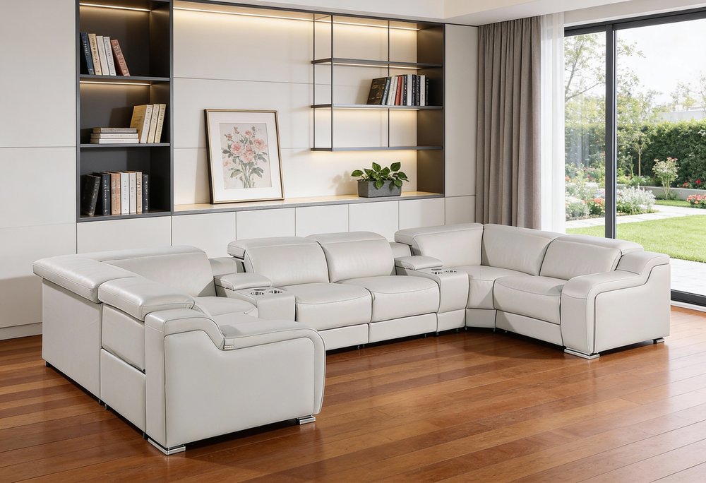 Superior construction from fabulously soft and high-grade leather gives this light gray italian leather power reclining u shaped eight piece...