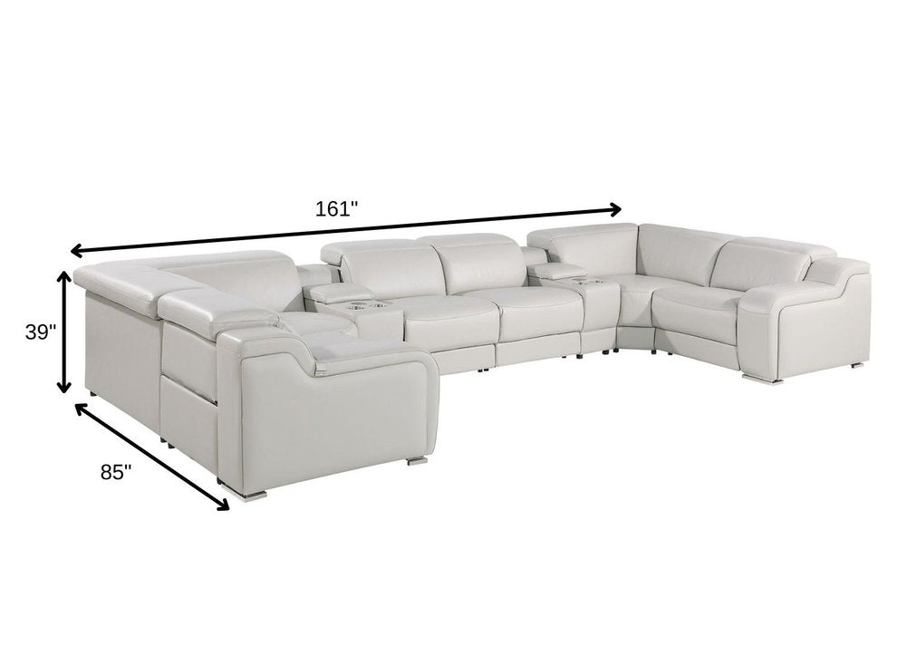 Light Gray Italian Leather Power Reclining U Shaped Eight Piece Corner Sectional With Console
