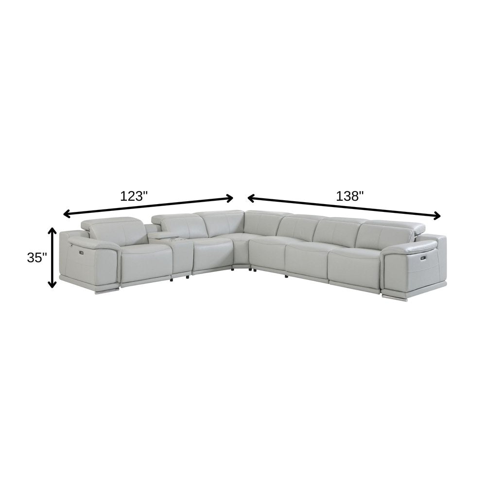 Light Gray Italian Leather Power Reclining U Shaped Seven Piece Corner Sectional With Console