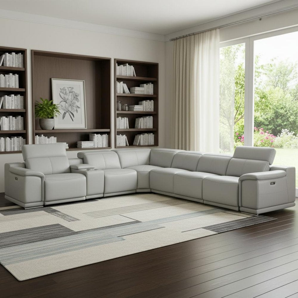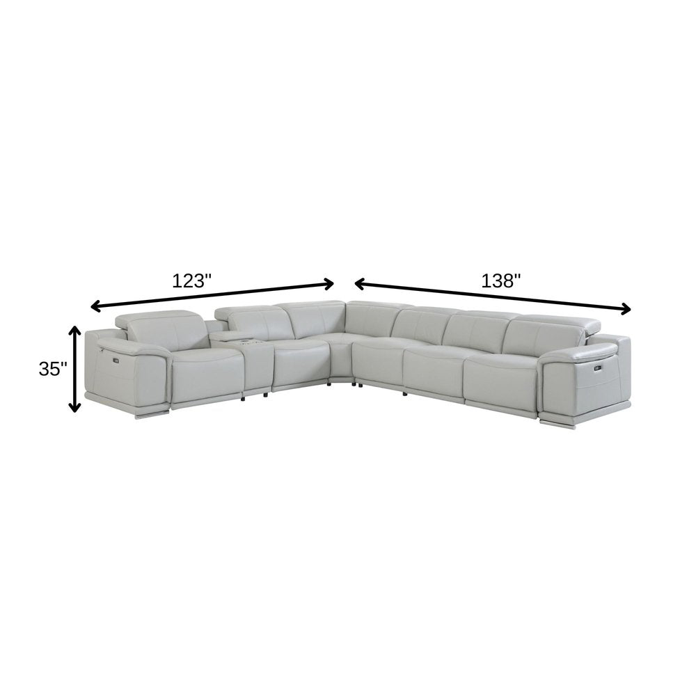 Light Gray Italian Leather Power Reclining U Shaped Seven Piece Corner Sectional With Console