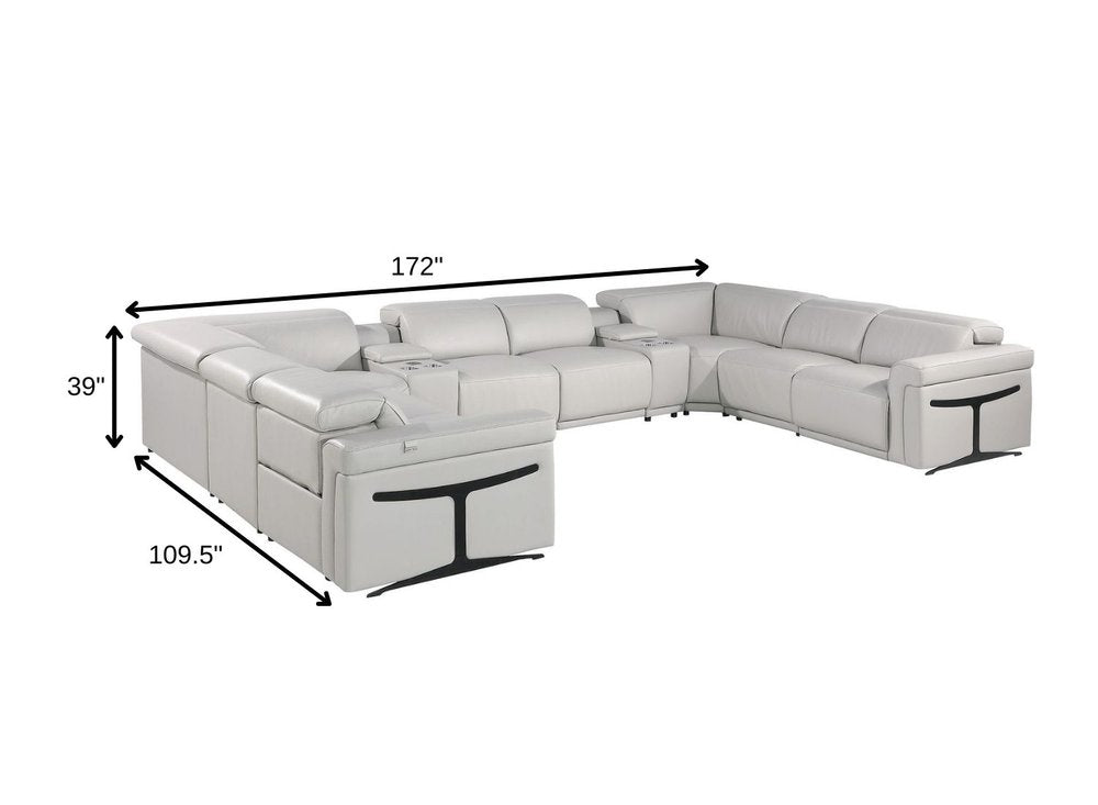 Light Gray Italian Leather Power Reclining U Shaped Ten Piece Corner Sectional With Console