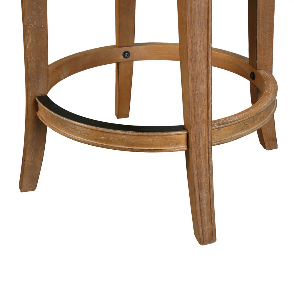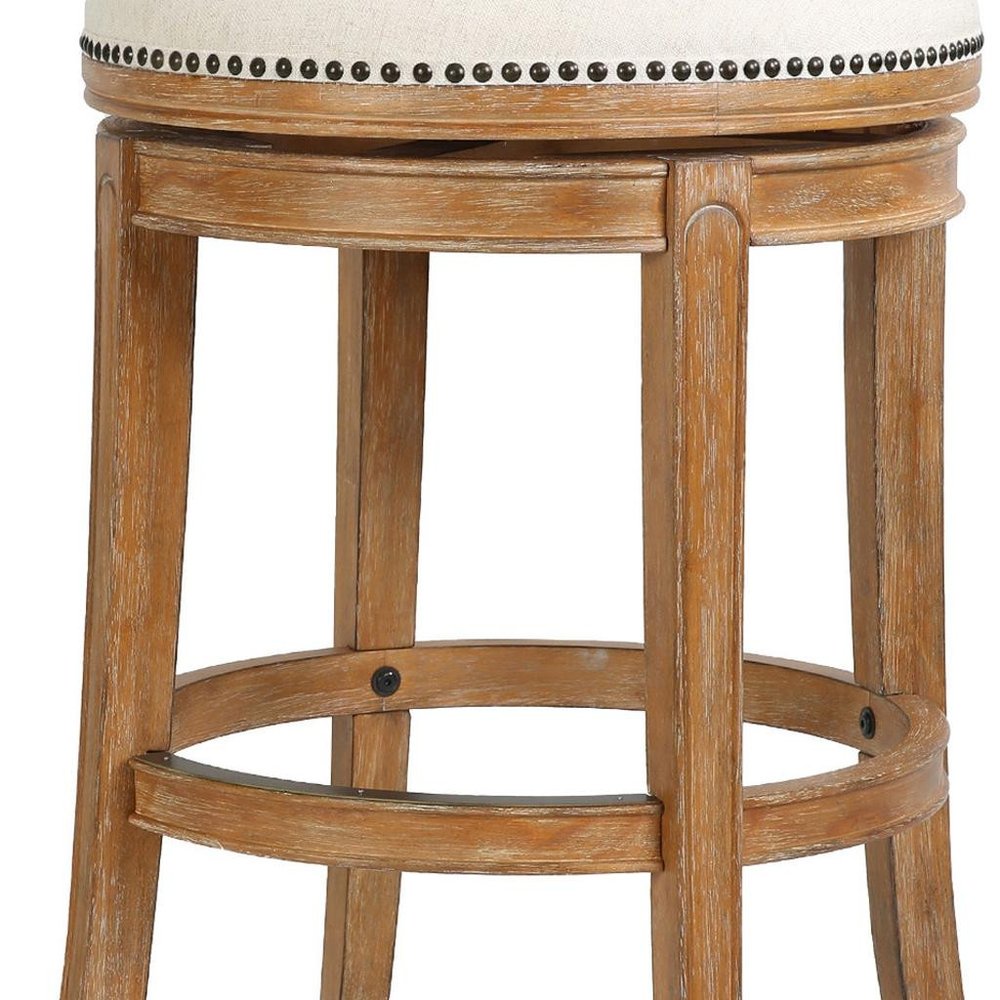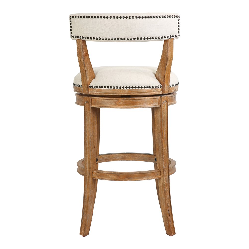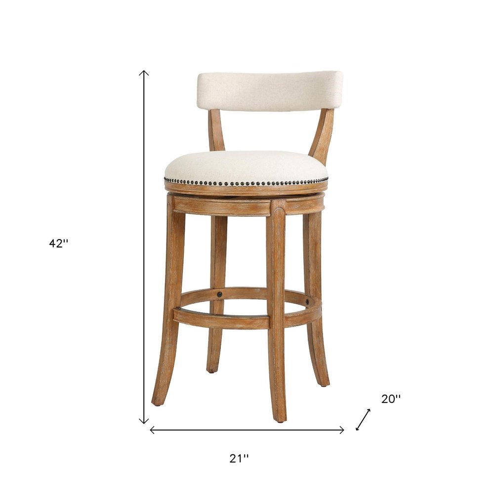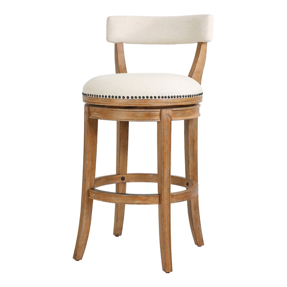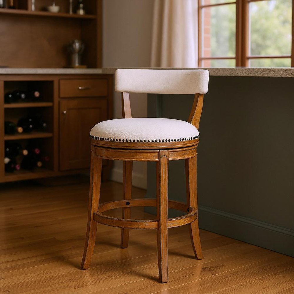 Linen and Brown Fabric and Solid Wood Low Back Bar Height Swivel Bar Chair