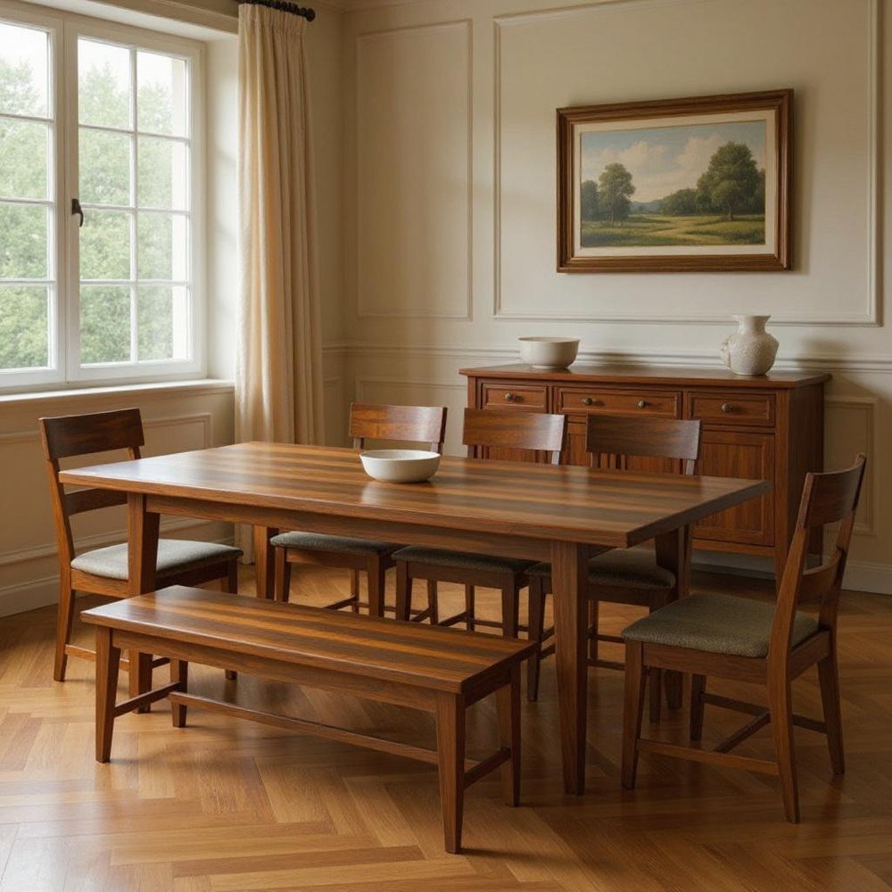 This nine piece brown solid wood dining set with eight chairs and one bench is the right blend of style... Read more