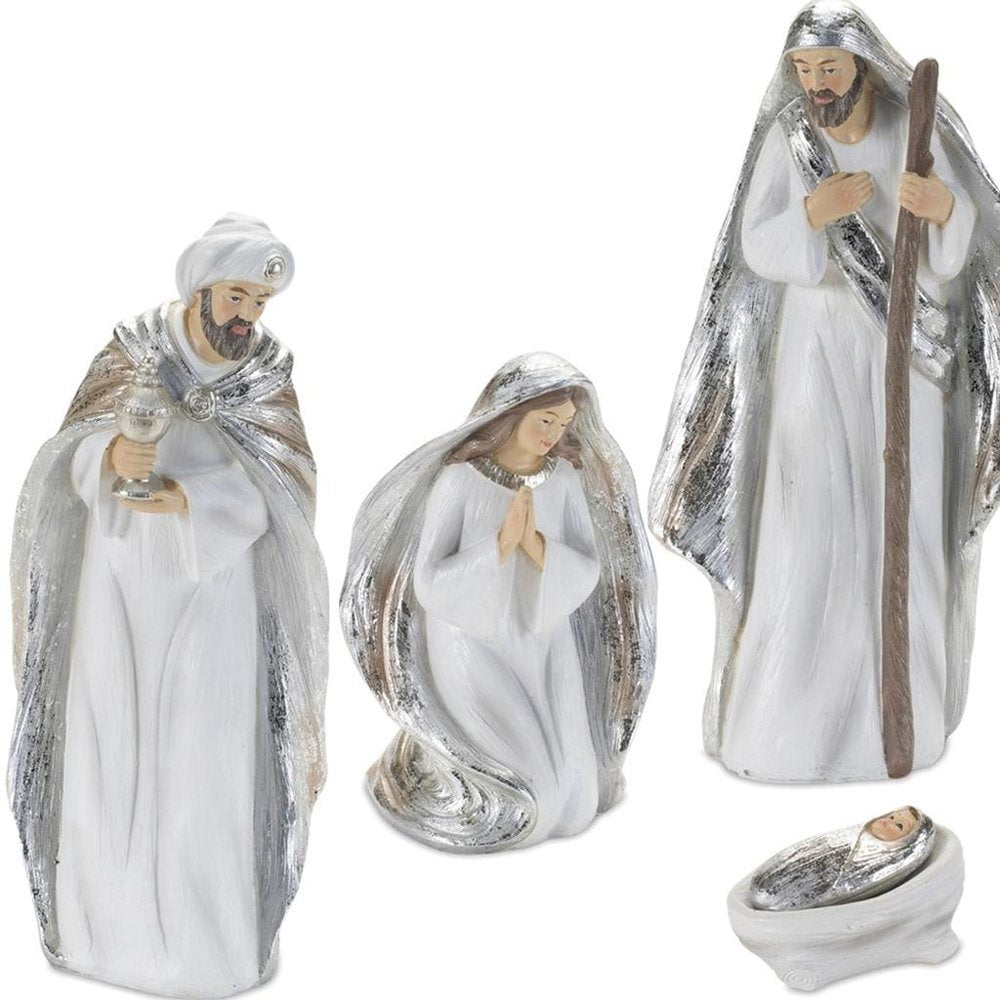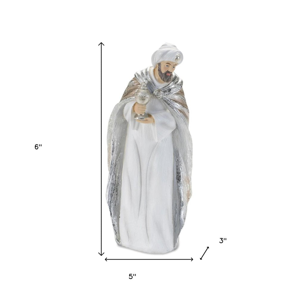 Set of Six White And Silver Resin Christmas Nativity Figurines