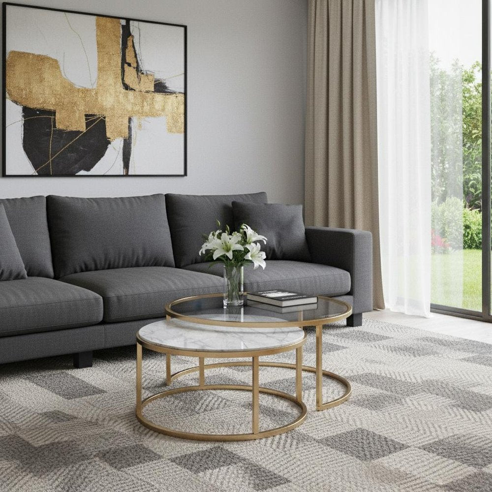 Set of Two Clear White and Gold Glass And Faux Marble And Iron Round Frame Nested Coffee Tables