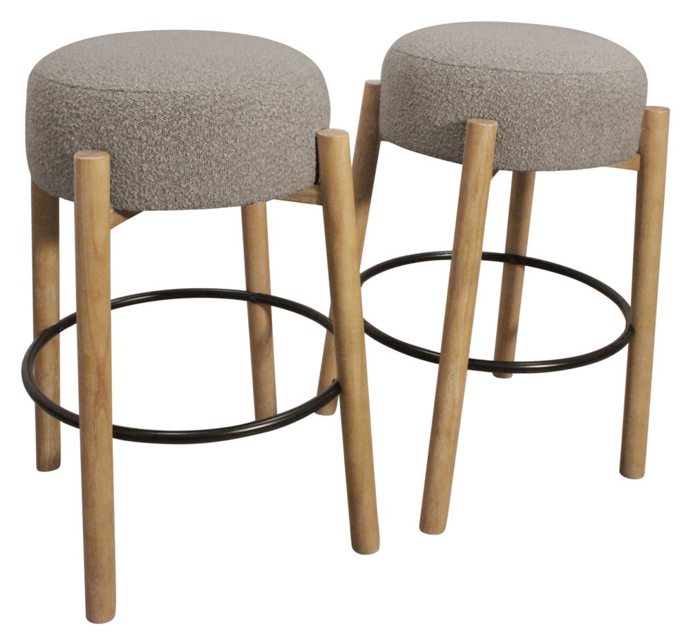 Set of Two Gray and Natural Fabric and Solid Wood Backless Bar Height Bar Chairs