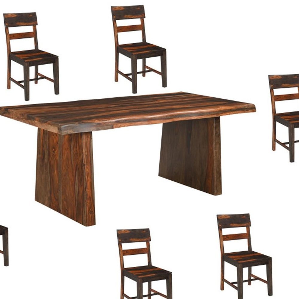 Seven Piece Brown Solid Wood Dining Set with Six Chairs and One Bench